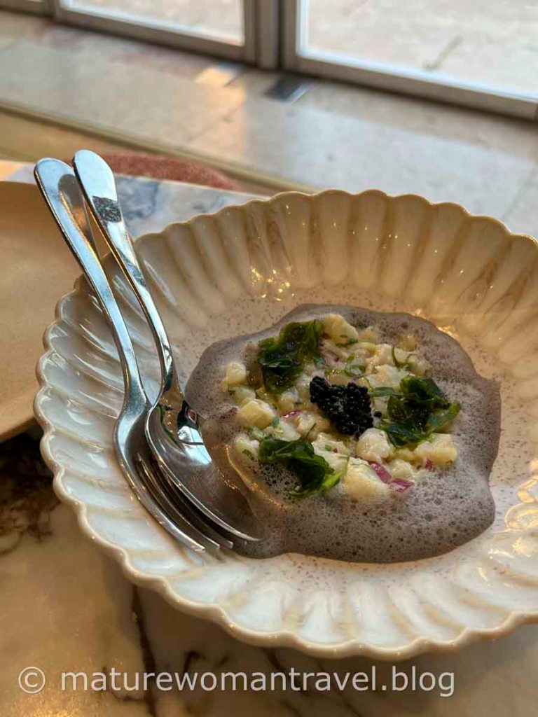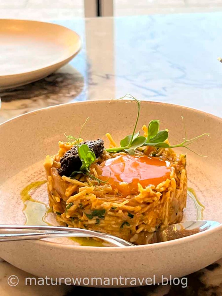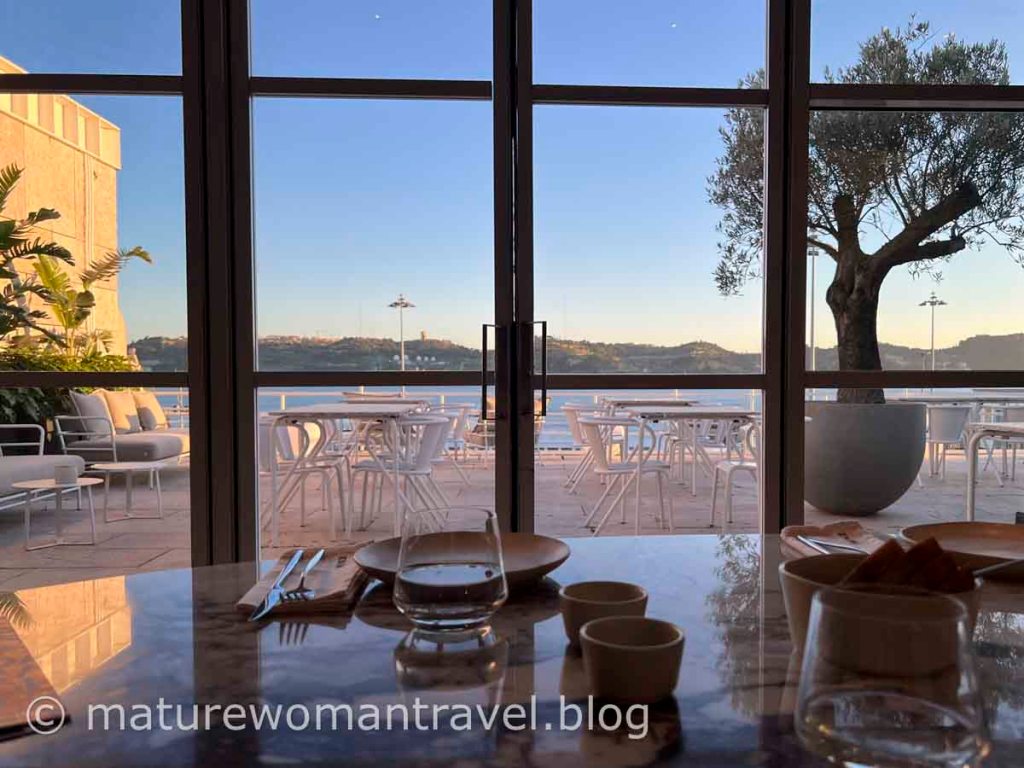 接近黃昏天氣有點冷,在帝國廣場旁的會議中心3樓找到一家隱密的Sauvage CCB餐廳,服務人員帶領我們在落地窗前的位置就坐,面對發現者紀念碑及太加斯河,絕佳的視野,河上船隻在夕陽中航行畫面很美。餐廳新穎,裝潢格調高雅,坐在寬敞的沙發及大理石桌用餐,服務人員親切解說。菜色富創意,擺盤精緻,除龍蝦燉飯有點鹹,其他都很美味,價位略高,但如此美景及高水準服務絕對值得。