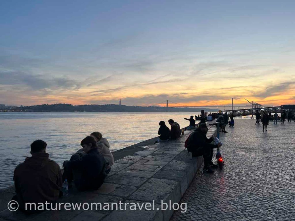 吃得很滿足打算到河邊散步,請教餐廳服務人員如何走?他很熱心的指路,得先左再右"之"字形的下坡,果然順利找到像海一樣的河,已有許多遊客來此觀賞風景,不遠處的4月25日大橋和舊金山金門大橋相似度極高,把握黃昏時刻捕捉里斯本的美麗景色。