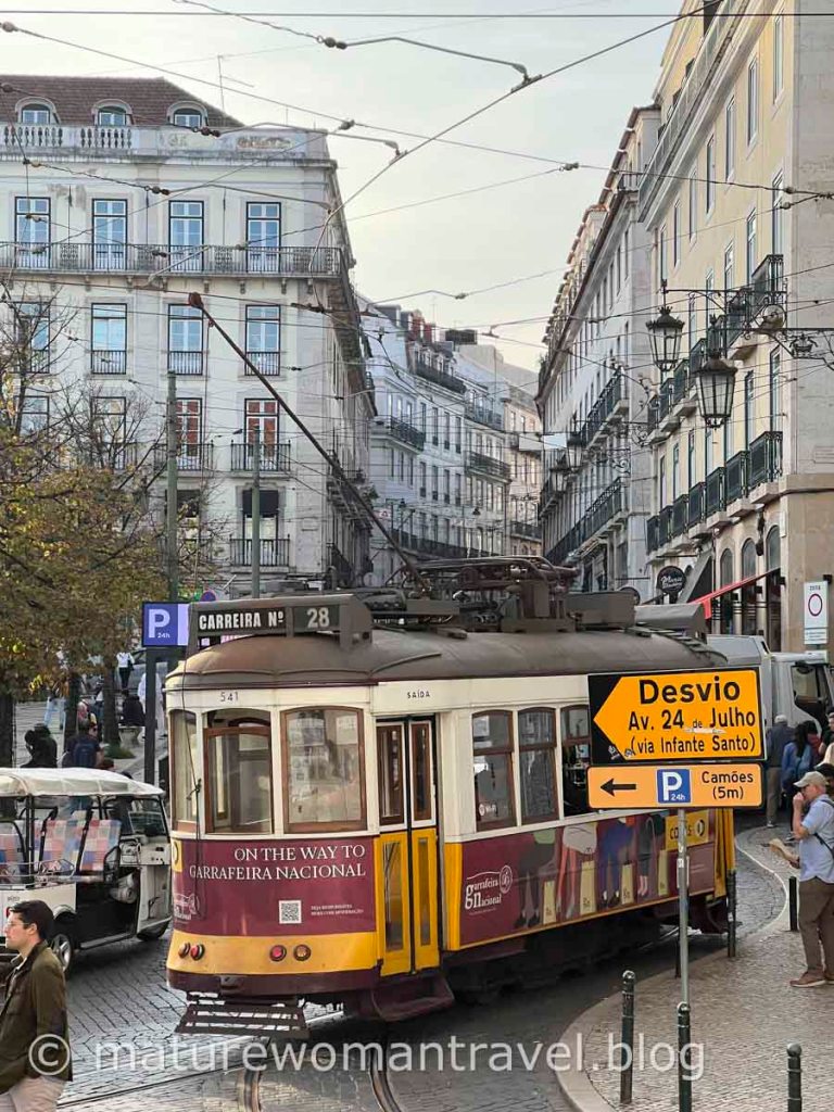 里斯本街道坡度頗大,穿梭在巷弄的有軌黃色電車是其特色,尤其以28號電車路線取景的明信片最暢銷。為了找尋28號電車的身影,我們嘗試在街角等候,但站在人來人往的街道不太恰當,等了一會沒發現電車就放棄了,沒想到在走完景點回住處時經過電車轉運站,同時看到三部電車出沒,馬上按下快門,拍了許多電車的身影,感到心滿意足。