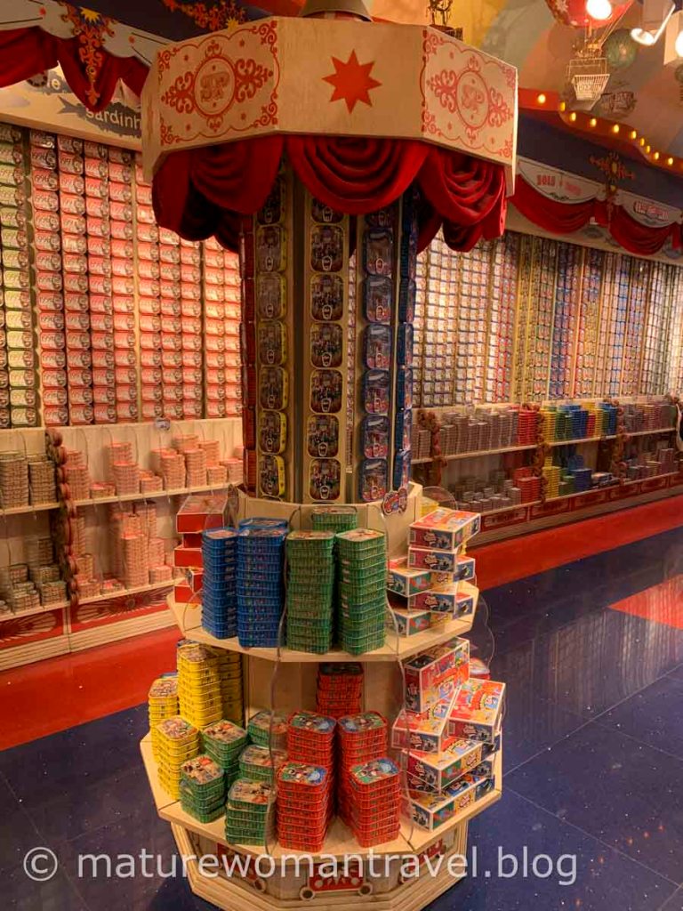 在廣場旁發現一家很特別的商店,原以為是遊樂場,色彩超繽紛,仔細看才發現整間店是由各式各樣的沙丁魚罐頭推疊出不同的可愛造型,正是知名的葡國沙丁的奇妙世界,佩服運用不同顏色的沙丁魚罐頭製造歡樂氣氛的行銷美學。