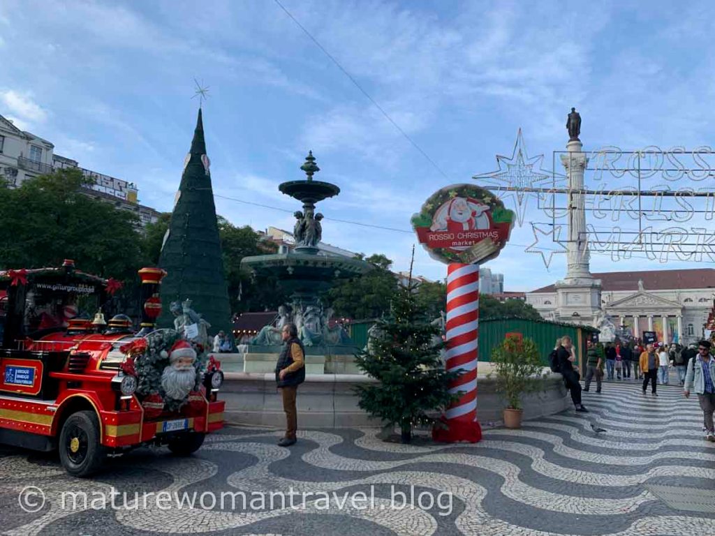 走下坡來到Rossio車站旁的佩德羅四世廣場,11月下旬已佈置成聖誕市集,像台灣的夜市有吃有玩,好熱鬧,廣場中央的噴泉和入口的聖誕樹、紅色小火車造型裝置藝術,充滿濃濃的聖誕節氣氛,忍不住駐足觀賞拍照。