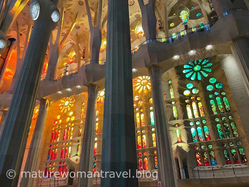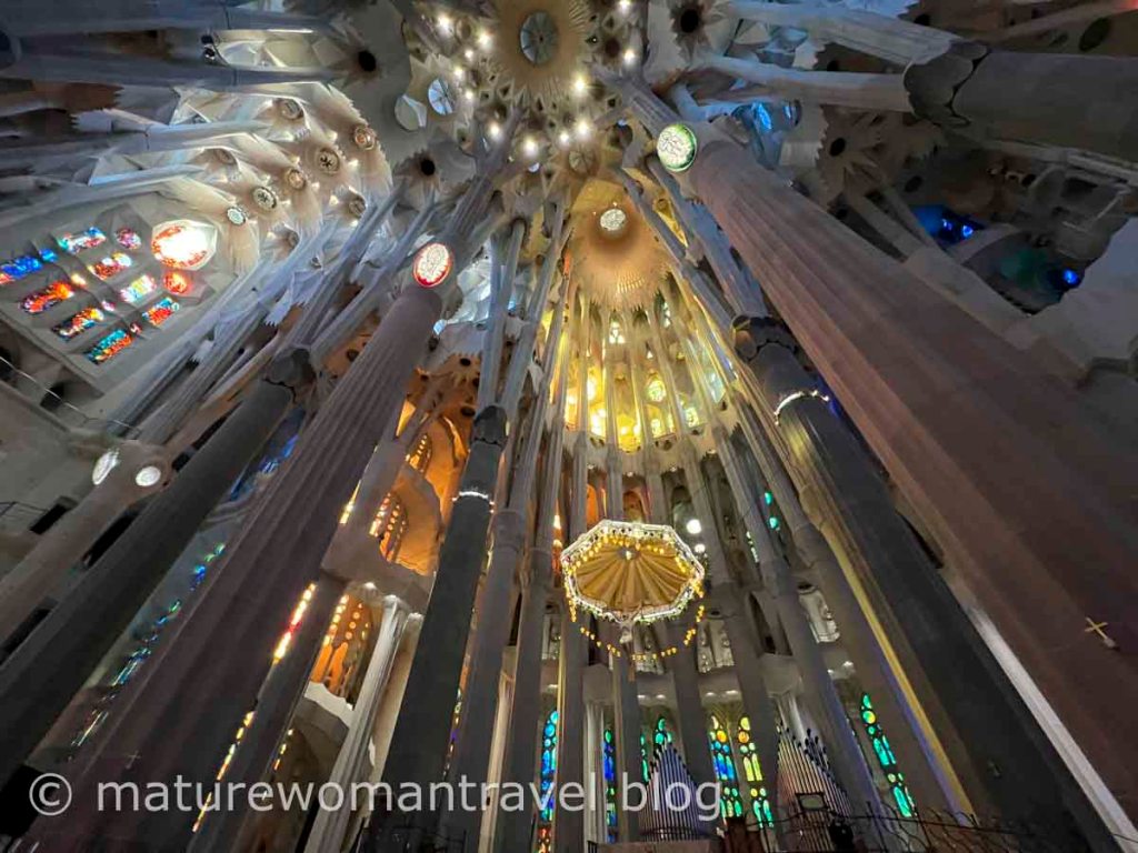 終於等到我們進入聖家堂參觀,在中文語音導覽引導,從入口外牆精美雕刻與宗教相關的意義,再解說高第的設計及施工原理。教堂內更令人驚豔,沒有金壁輝煌的華麗裝飾,感覺像走入森林,神袐而莊嚴。原來那一座座的高塔是由一根根樹幹狀的石柱支撐著,抬頭仰望那石柱在塔頂前分枝,如花朵般在塔中綻放,美麗炫目。左右兩側運用藍、橙的彩繪玻璃,透過自然光線呈現晨、昏的氛圍。難以言喻,一定得親自感受。