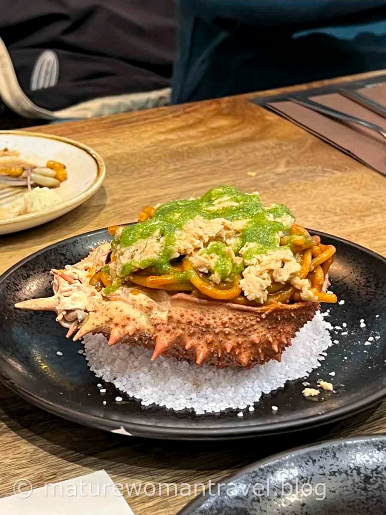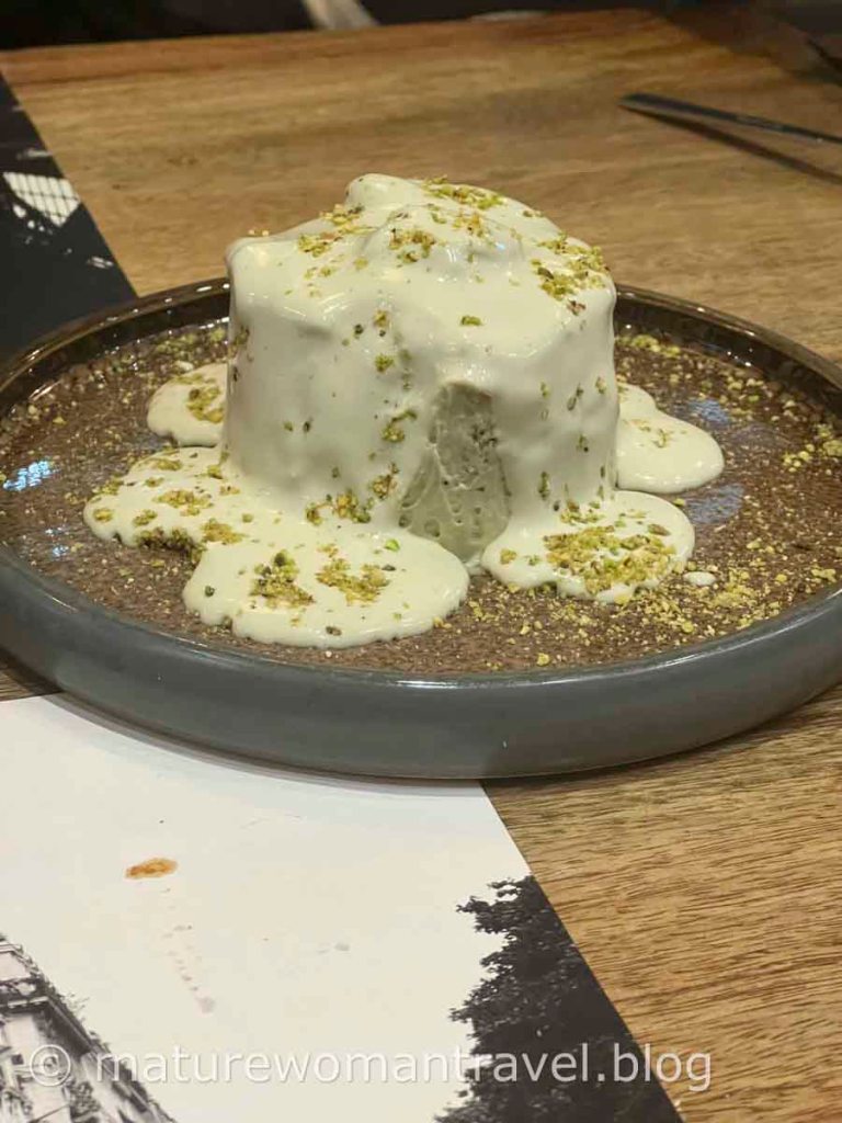 點了茄子、鱈魚、蟹肉義大利麵等,看起來是廚師用心烹調的高級創意料理,但對平時習慣吃清淡的我們,嘗起來過份的鹹,尤其鱈魚醃的大概太入味,令我們食不下嚥,實在可惜。點了二款甜點平衡一下口感,好看又好吃的開心果起士、巧克力熔岩蛋糕滿足我們的胃。