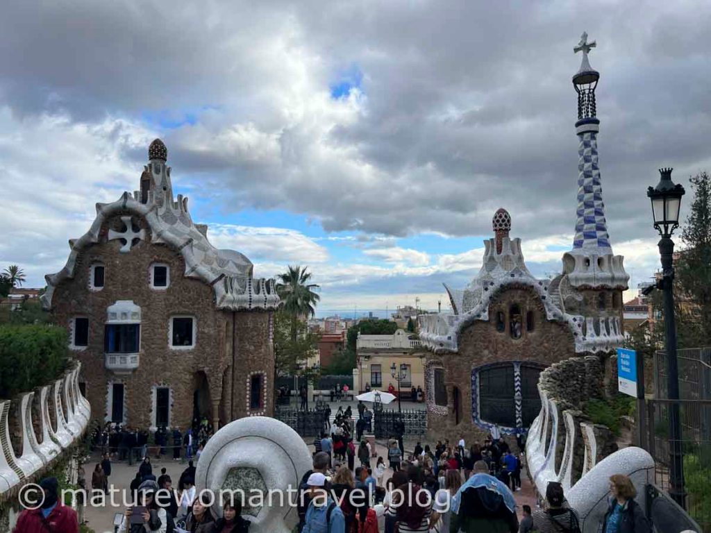 下坡快到出口,得經過有人數管制的平台,許多遊客在平台前方拍照,下方由許多石柱支撐,天花板及前方階梯以馬賽克鑲嵌可愛造型的裝置藝術,幾棟像糖果屋的建築,彷彿童話世界,正是高第之作。