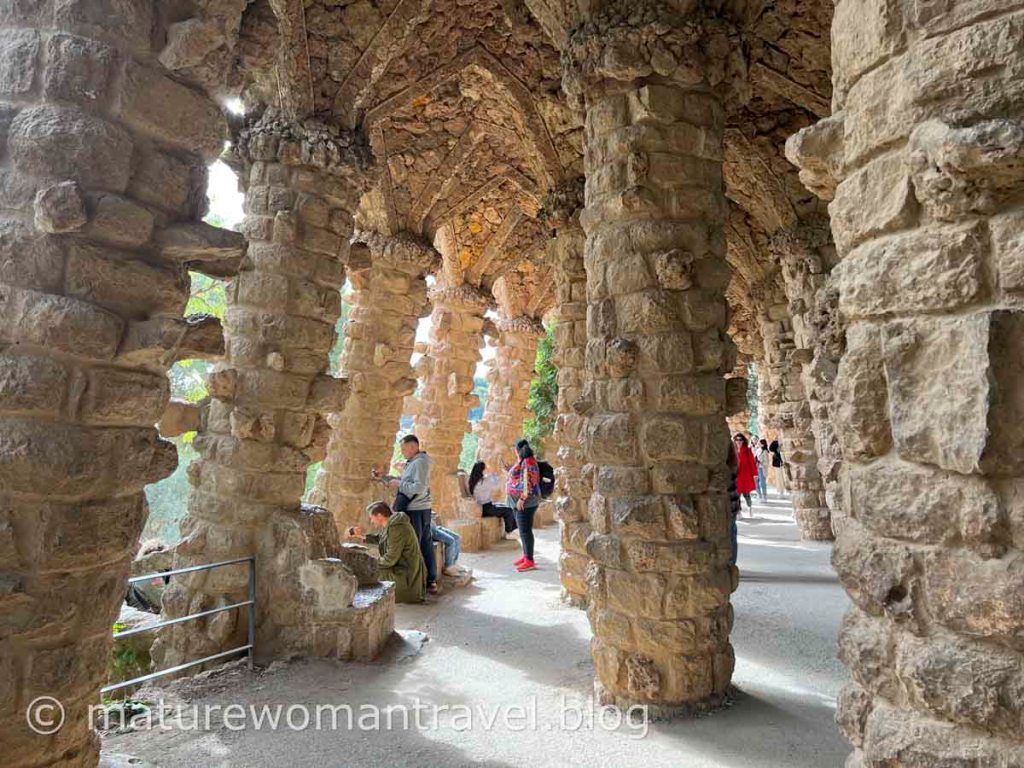 從火車站搭計程車到奎爾公園,這位在半山腰的高第知名傑作,搭車都能感受山腳到公園入口的坡度及長度,還是把體力保留著入園後再挑戰。爬一段階梯有些喘,其實也有較平緩的坡道,我們隨意的穿梭在高第設計的作品中。印象深刻入口不遠處高第設計的拱型長廊,如樹幹狀的傾斜石柱,彷彿是自然形成。