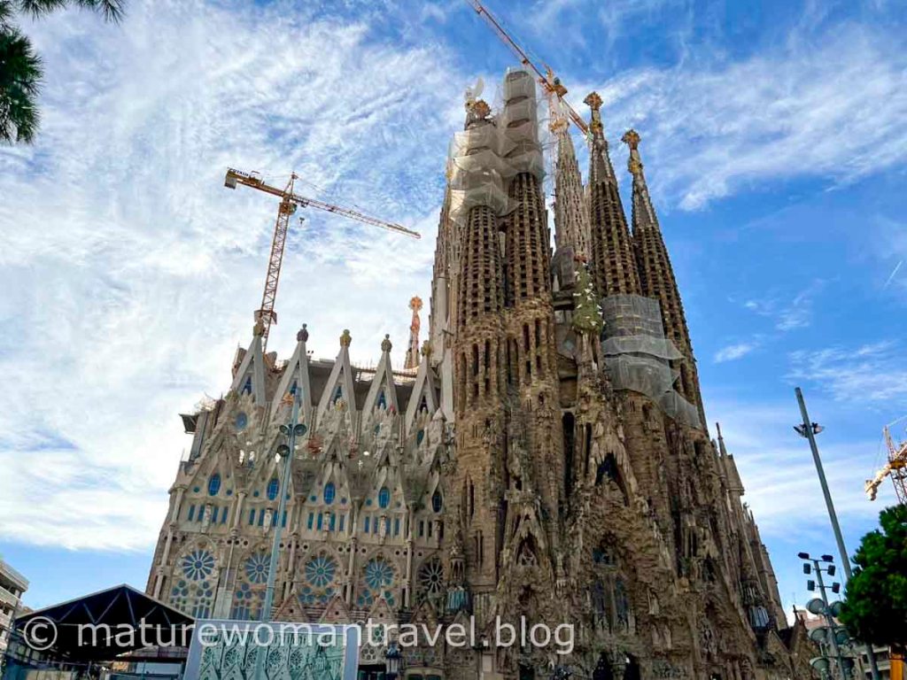 遊客真的太多,繞到後方公園好不容易才拍到高聳入雲的聖家堂全景,仰望由好幾座高塔形成的教堂,機械吊臂還不斷堆疊石塊,很難想像百年前如何施工?更佩服西班牙人為完成這不可能任務的決心與毅力。