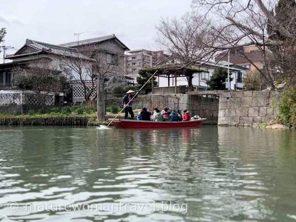 買船票稍等登船,約可搭12人的木船,靠人力撐篙前進,穿梭在棋盤狀交錯的運河中,欣賞兩岸古樸建築及庭園造景,適合文人或藝術家居住。偶有幾株櫻花綻放,更襯托風景秀麗。