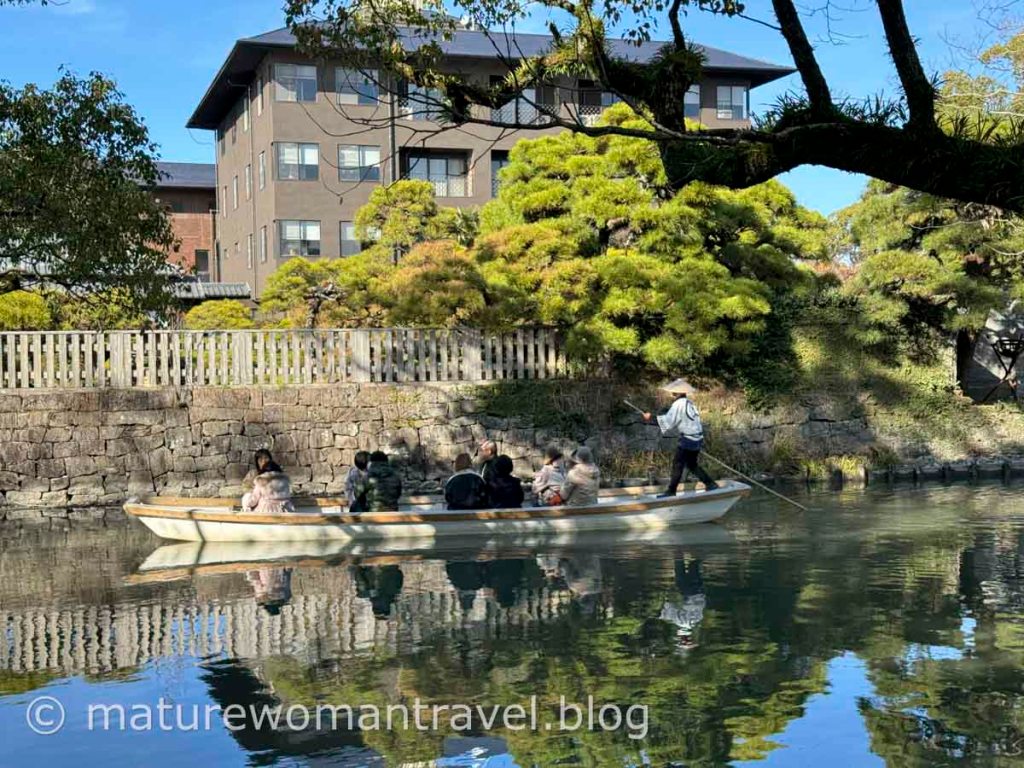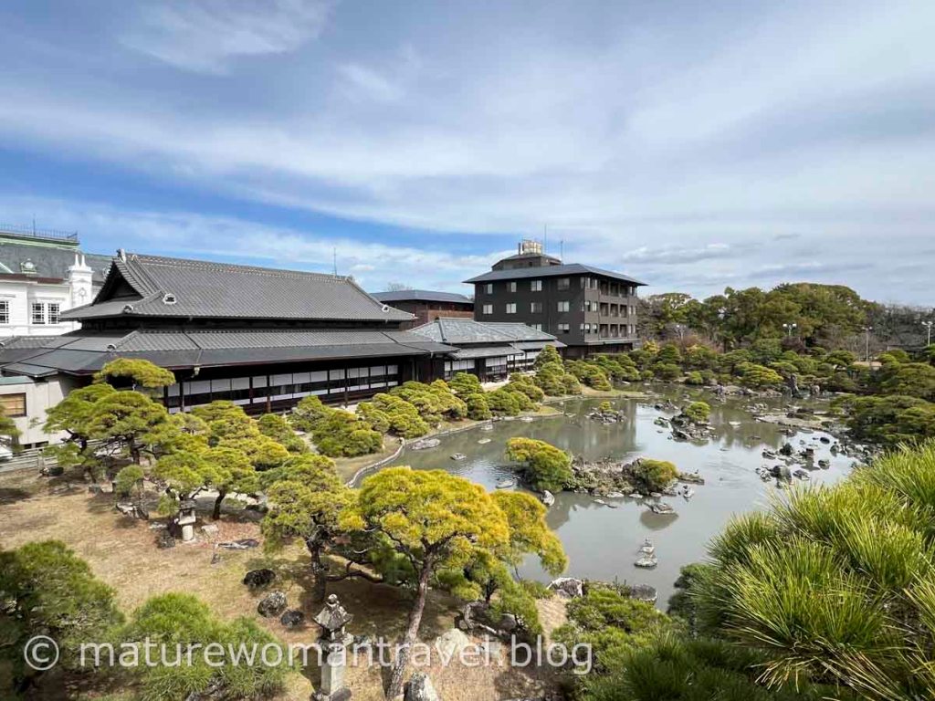部分立花邸改為飯店,當天中午有宴客無法進入參觀,從側面2樓欣賞松濤園造景,偌大的池畔種滿松樹,綠意盎然。庭園外柳川運河上輕舟滑過,構成一幅美麗的畫。