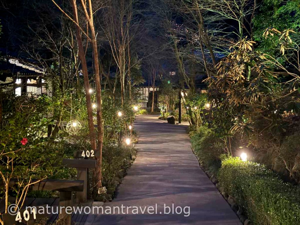 散步回旅館,行李已送到房間,服務人員引導進別館小木屋,非常幽靜,屋前庭園花草扶疏。
