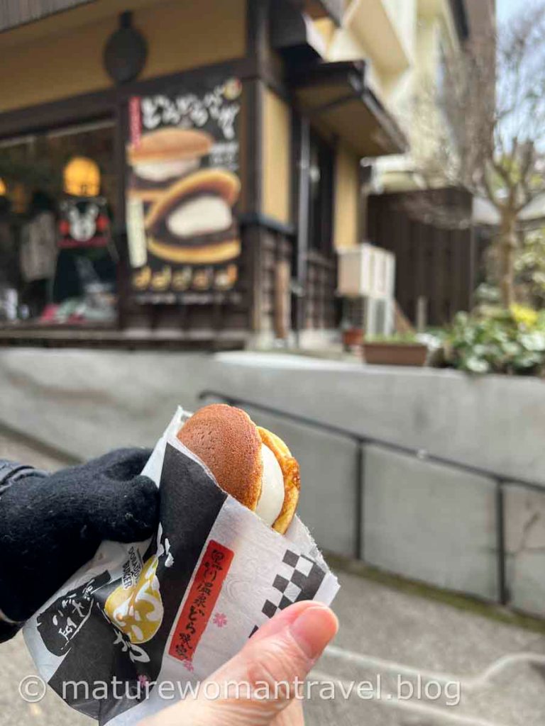 從旅館走下坡到溫泉街約10多分鐘,包圍在森林中,溪流兩側日式旅館各有特色。商店錯落其間,當地特色小物令人愛不釋手,甜點更是誘人,包有紅豆麻糬銅鑼燒、各種口味煎餅、滿滿餡料泡芙、得奬巧克力磅蛋糕,忍不住買來品嚐,大大滿足。