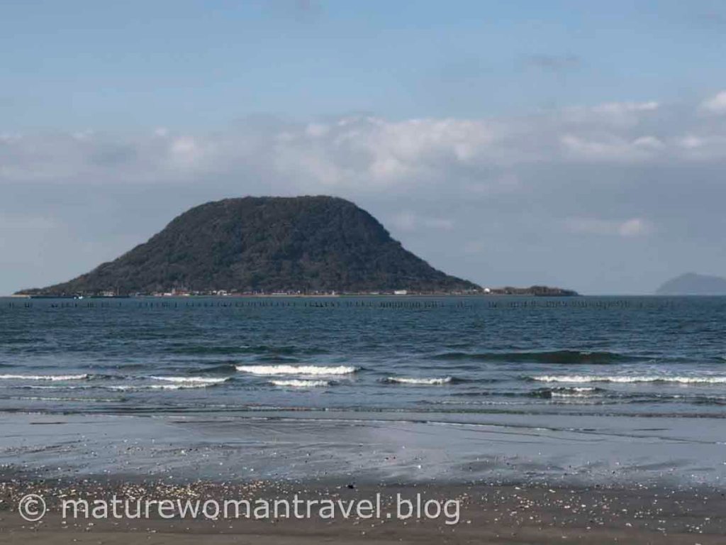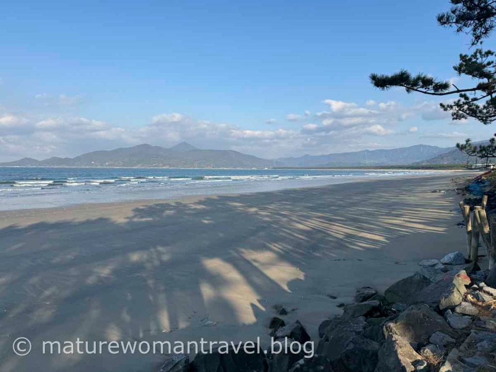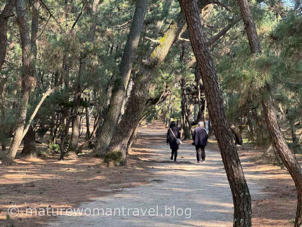 虹之松原從旅館走路10分鐘路程,種植百萬棵松樹,因強勁海風,造成松樹姿態各異,綿延5公里,相當壯觀。初春午後陽光下的松原很美,踩在掉落的松葉上,偶遇遊客散步其間,無喧嘩聲,只聽海浪拍岸及風吹過松林的聲音。見唐津灣佇立幾座島嶼,沙灘只有零星遊客,天氣冷沒人踏浪。
