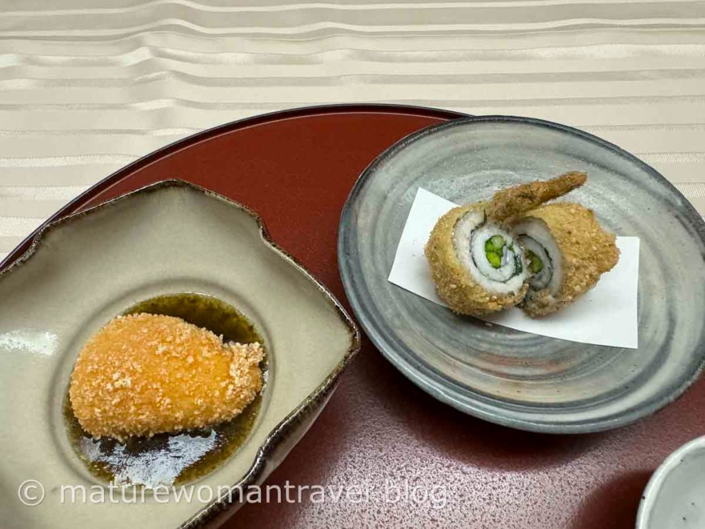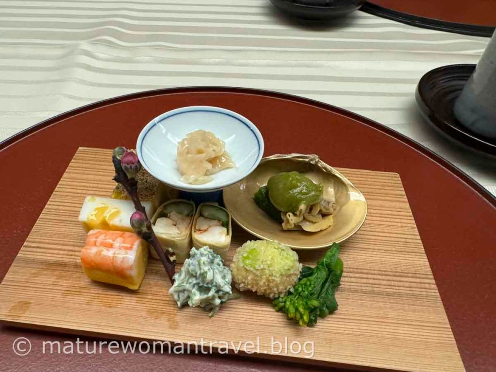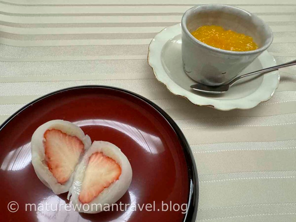 回到旅館泡湯休息一下,晚餐在房間內用餐,訓練有素的女將穿著和服,端著精心烹調的料理,為客人依序擺盤,常常得跪著服務,女兒關心的問:會不會太辛苦?女將回答:的確對腿力是一大考驗,在洋洋閣已服務20年,還有比她更資深的,此地常有國際觀光客投宿。雖然有些語言隔閡,仍非常敬業努力溝通,經過她介紹更了解廚師運用當地食材及料理方式,每道菜彌足珍貴,惜福感恩。