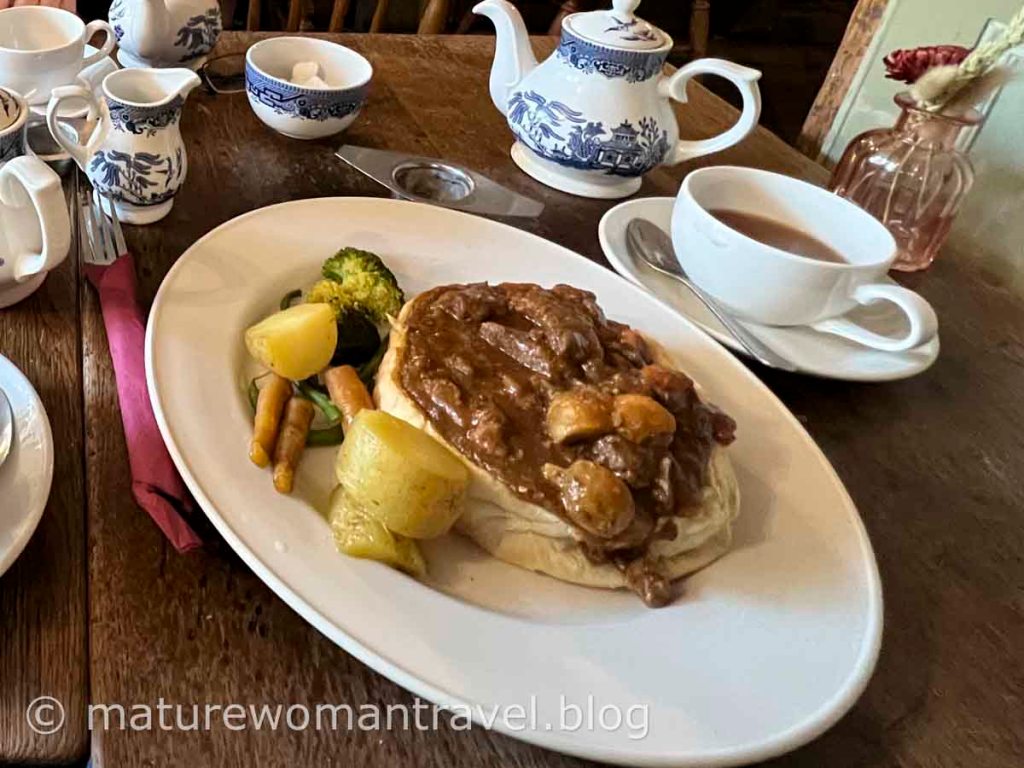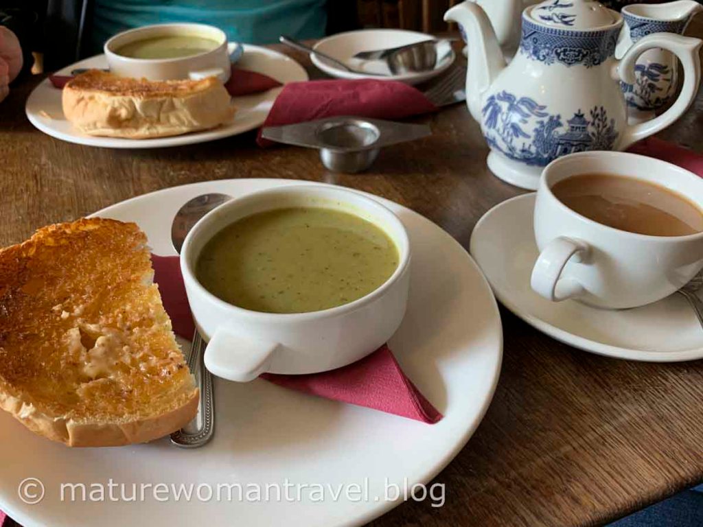目前地下室供遊客參觀製作麵包過程,並販售麵包及紀念品。1至3樓是茶點餐廳,我們點了套餐,除傳統的英式紅茶外,第一道以自製麵包配上毛豆泥湯,非常合口味;第二道麵包淋上滿滿牛肉及醬汁;第三道甜點已經撐到快吃不完。吃得好滿足的走回車站搭火車回倫敦。