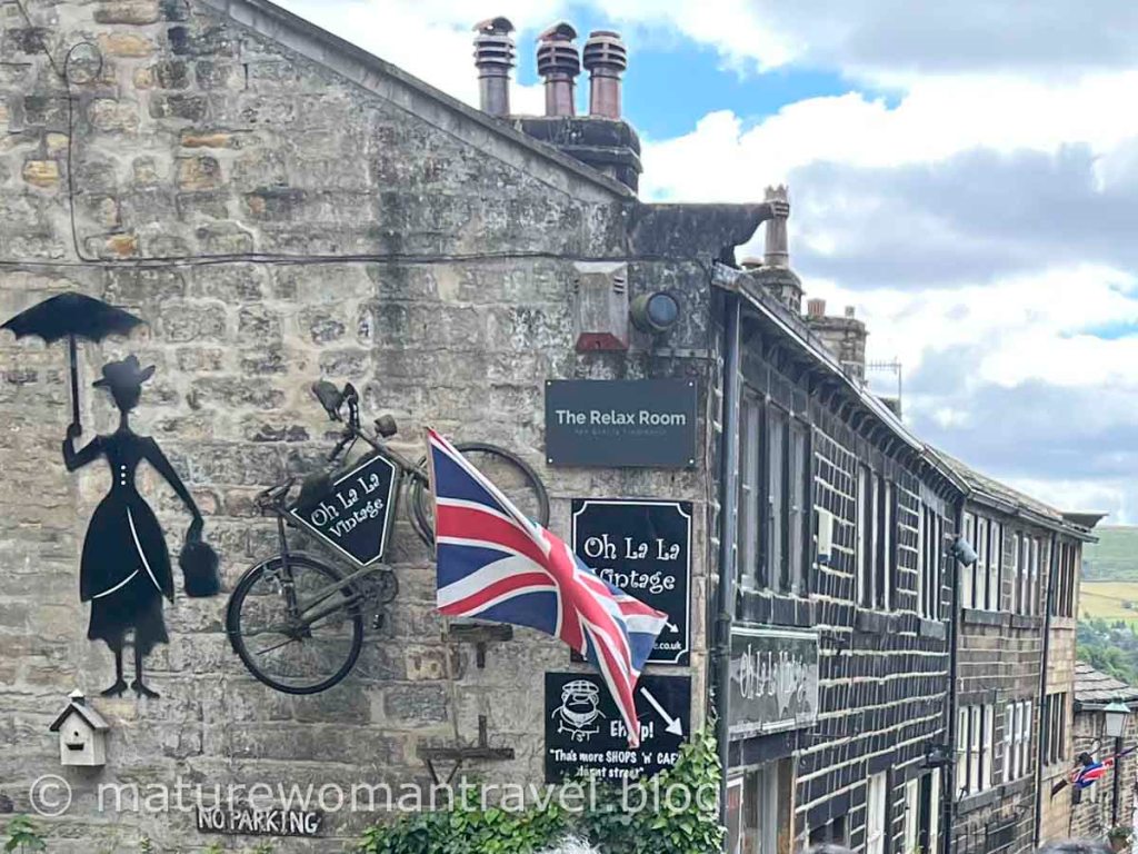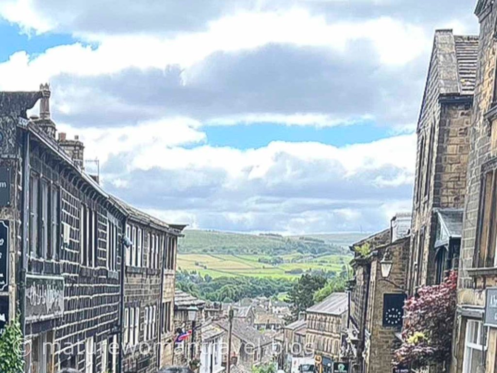 車沿著山谷行駛,鄉間田野風光明媚。偶有小鎮錯落其間,約15分鐘抵達賀沃斯。在小鎭的Central Park下車,沿著公園爬坡進入Main Street,街道兩旁保留歴史建築,部分改為飯店、餐廳。這條有點陡的石板路約1公里左右,爬上高處回望街景,在遠處田園景色襯托下,像一幅美麗的畫作,正是我嚮往親眼目睹的英國特色小鎮。