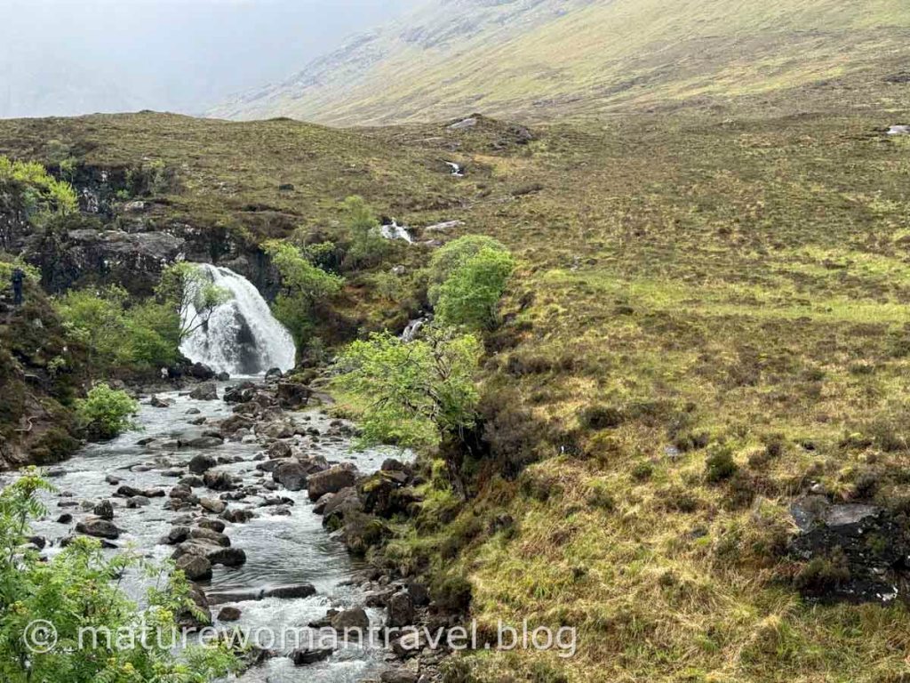 第二站安排Fairy Pools的健行活動,幾位長者留在車上,其他人冒著風雨啓程,剛開始步道平緩,沿著溪流漸往上爬坡,時有瀑布出現,遠山、荒原、溪流景觀,走了好一段健行步道,雨勢不減反增,中途折返,有些可惜。