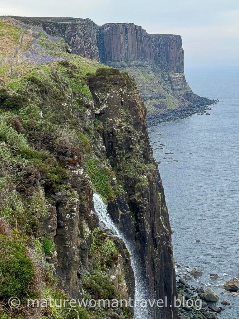 麥爾特瀑布(Kilt Rock Waterfall – Creag An Fhèilidh)位於斯凱島東北海岸,懸崖峭壁與瀑布飛奔入海的壯麗景觀,瀑布由埃利薩德 (Ellisadder) 附近的米爾特湖 (Loch Mealt) 的淡水注入,跌落到岩石海岸線和水下 60 多米的拉賽海峽 (Sound of Raasay)。觀景台與瀑布平行,拍照取景時得小心手機落入海中。