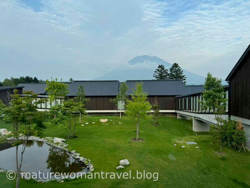 6月是旅遊淡季,少了滑雪的遊客感覺俱知安清靜許多。火車抵達時樂水山(Raku Suisan)飯店已派車在車站等候,車開進山區沿途見大型飯店和渡假木屋,可以想像冬天有衆多遊客蒞臨。來到半山腰一家優美木造旅宿,相當新穎的設計,挑高斜屋頂,寬敞的大廳落地𥦬面對北海道最高峰羊蹄山,庭園四週散落18間Villa式的木屋,每間皆可看到羊蹄山的景色。羊蹄山高 6,227 英尺的對稱層狀火山,因山型酷似富士山而成為當地知名地標。