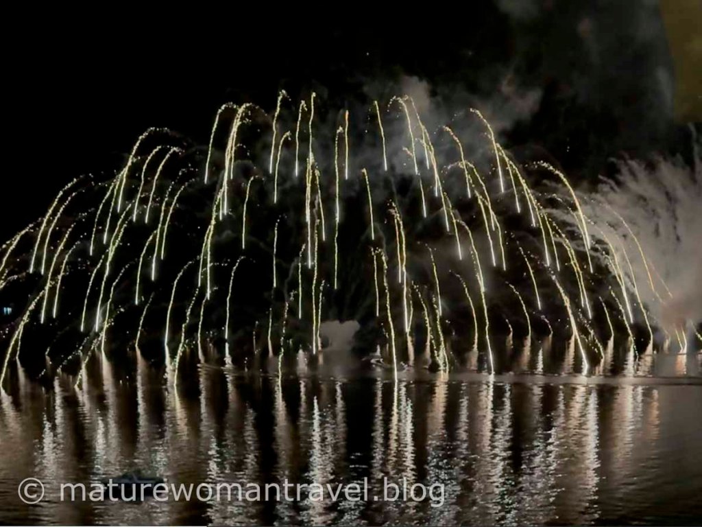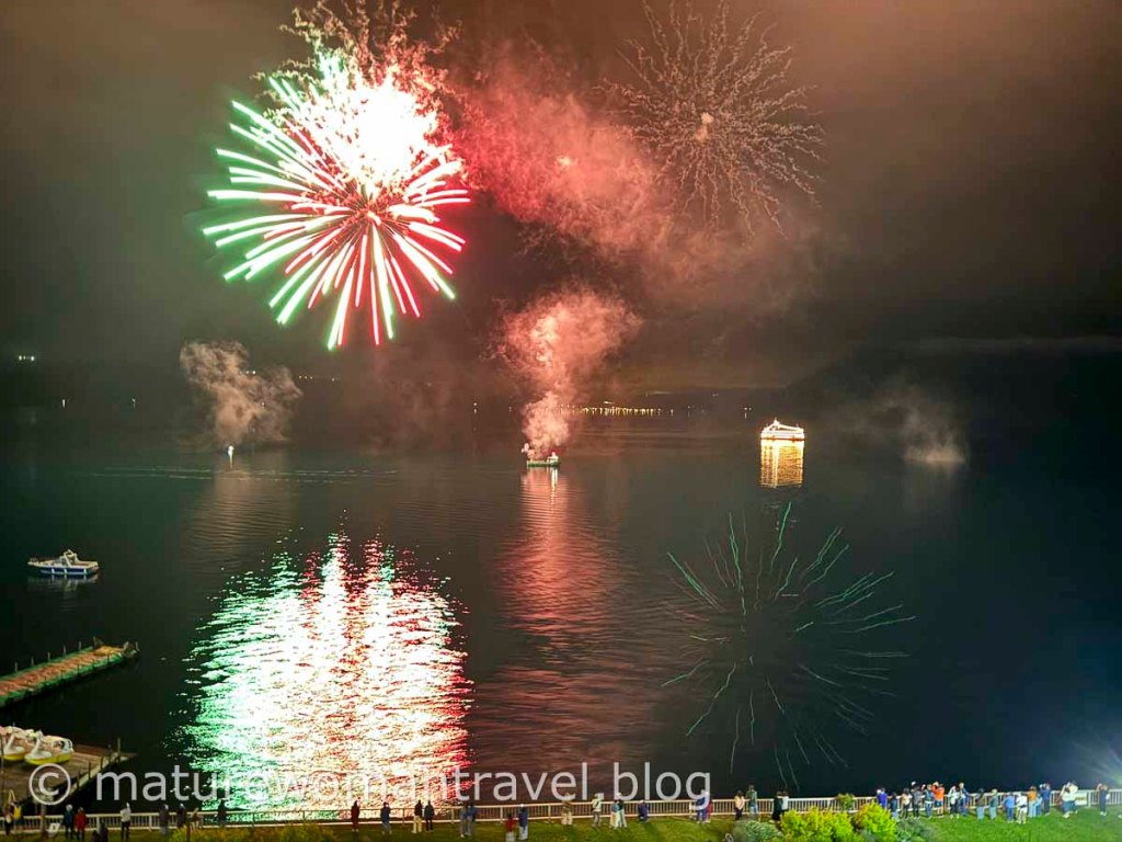 飯後最期待的是煙火秀表演,我們守候在房間窗台邊,晚上8點45分煙火由一艘船在湖面行進中施放,有的向空中發射,鮮豔火花飄落水中,有的向水面發射,像傘狀倒影在湖水,在湖邊飯店區來回表演。