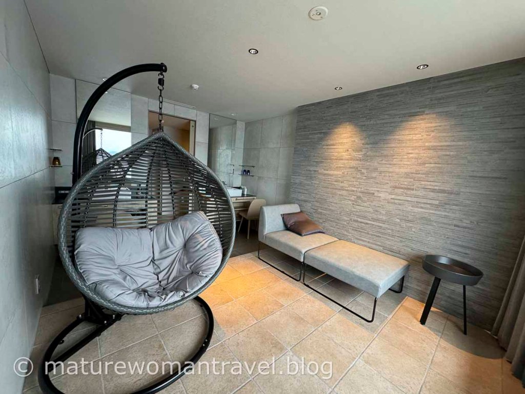 入住的行政套房約有100平方米,面對湖景,西式、日式房各一間,客廳寬敞,附私人湯屋,泡湯後可坐在藤椅搖籃休息。