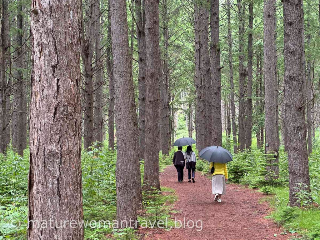 島上自然生態步道得登記才能進入,雖然下著雨但步道鋪著木屑,行走不會溼滑,選段平緩的路線健行,走在筆直細長的樹林間,來埸芬多精的森林浴。