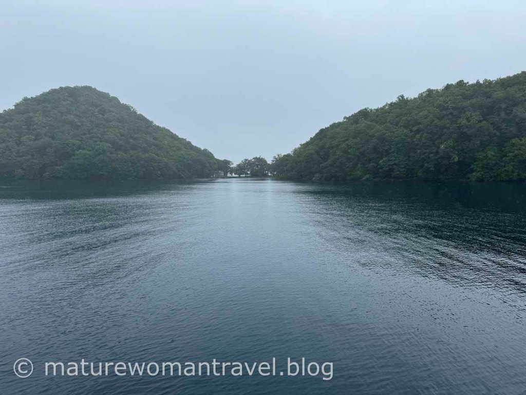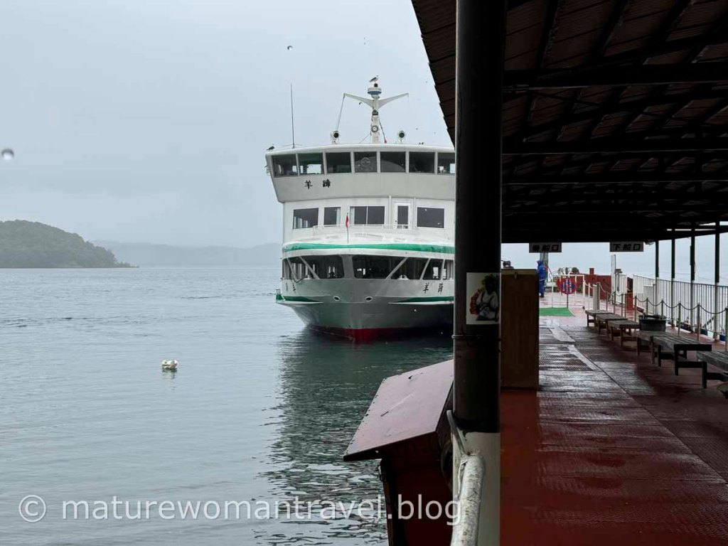 回中島碼頭等待返回的船班,見木棧道旁湖中鯉魚及湖面白鵝自在悠游。不久船靠岸,排隊依序登船,在雲霧中遠離湖中鳥嶼,洞爺湖美景當之無愧。