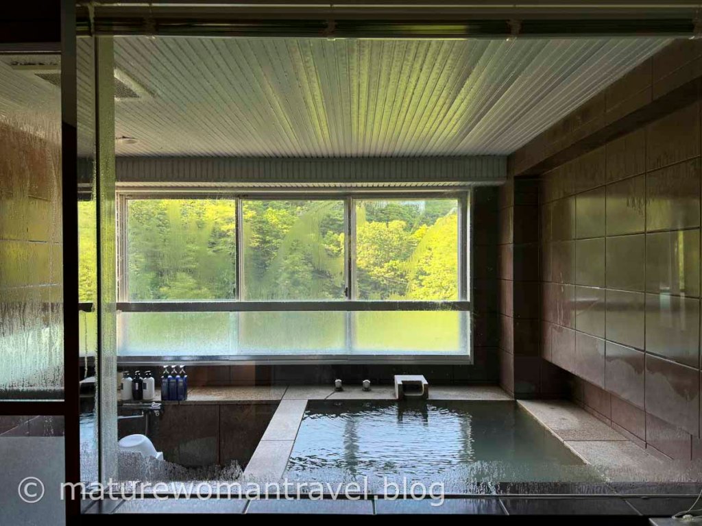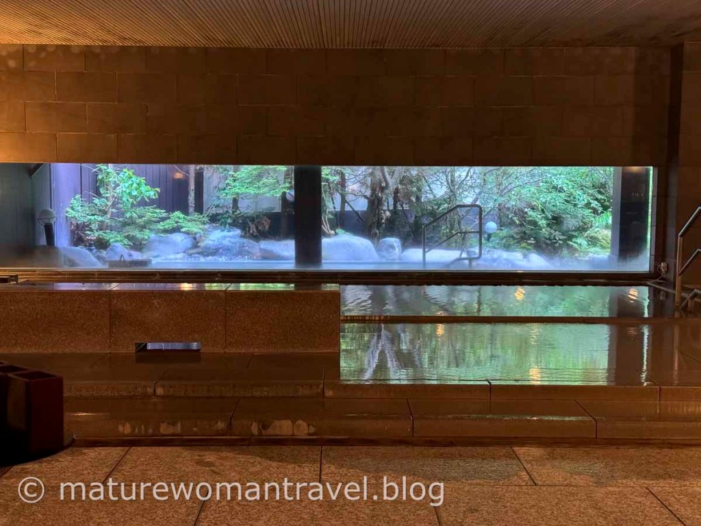 大浴場簡約風格,落地窗引入日式庭園造景,無論在室內或戶外泡湯皆令人放鬆。因房間數不多,且有年齡限制,不會同時多人入浴,浴池雖不大,空間相當足夠。