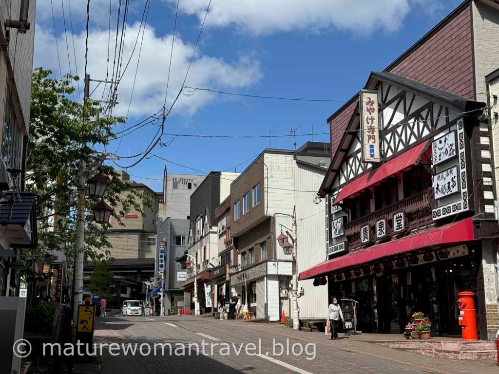 看完變臉表演見前方有輛復古造型的車停在路邊,正是前往登別地獄谷的接駁車,見即將發車馬上跳上車。坐在木製長椅,車沿著温泉街緩緩行駛,右轉上坡雖只有短短5分鐘車程,但非常感謝可以少爬點坡。