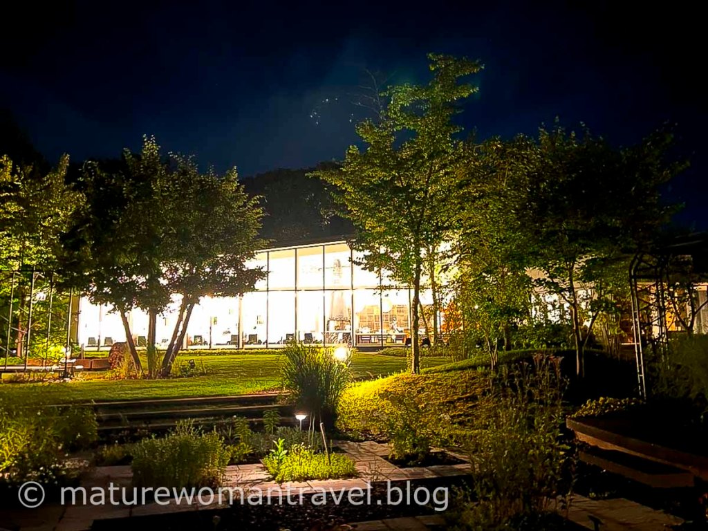 回飯店當然不忘到湖邊欣賞夕陽,但已肌腸漉漉期待晚餐,穿過玻璃屋廊道,餐廳挑高落地窗面對花園。