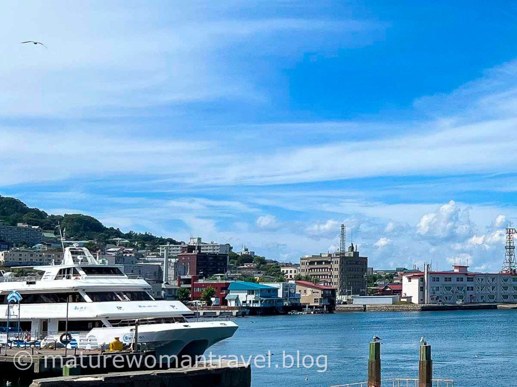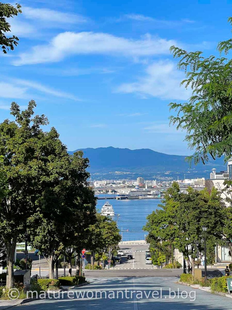 搭䌫車下函館山順道到八幡坂散步,是一條從函館山延伸到大海的坂道,筆直的斜坡道、兩旁行道樹、遠處湛藍海水、港口停泊船隻,遠山藍天白雲為背景,構成一幅美麗的畫作,是許多廣告與日劇的取景地。