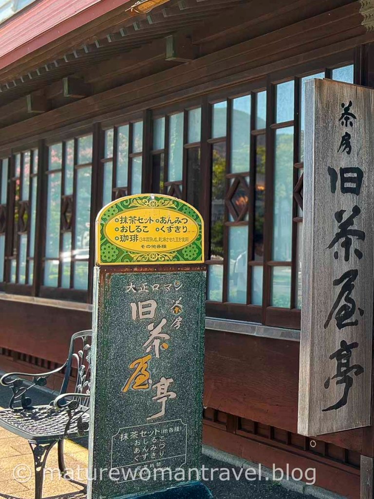 舊茶屋亭位在紅磗倉庫附近,古樸的建築佇立在街角,推開木門,融合和洋風格的氛圍,彩繪玻璃窗透進溫暖的陽光,燈飾同樣是彩繪玻璃,歐式的餐桌椅,令人以為來到西餐廳,但賣的是道地的日式茶點。