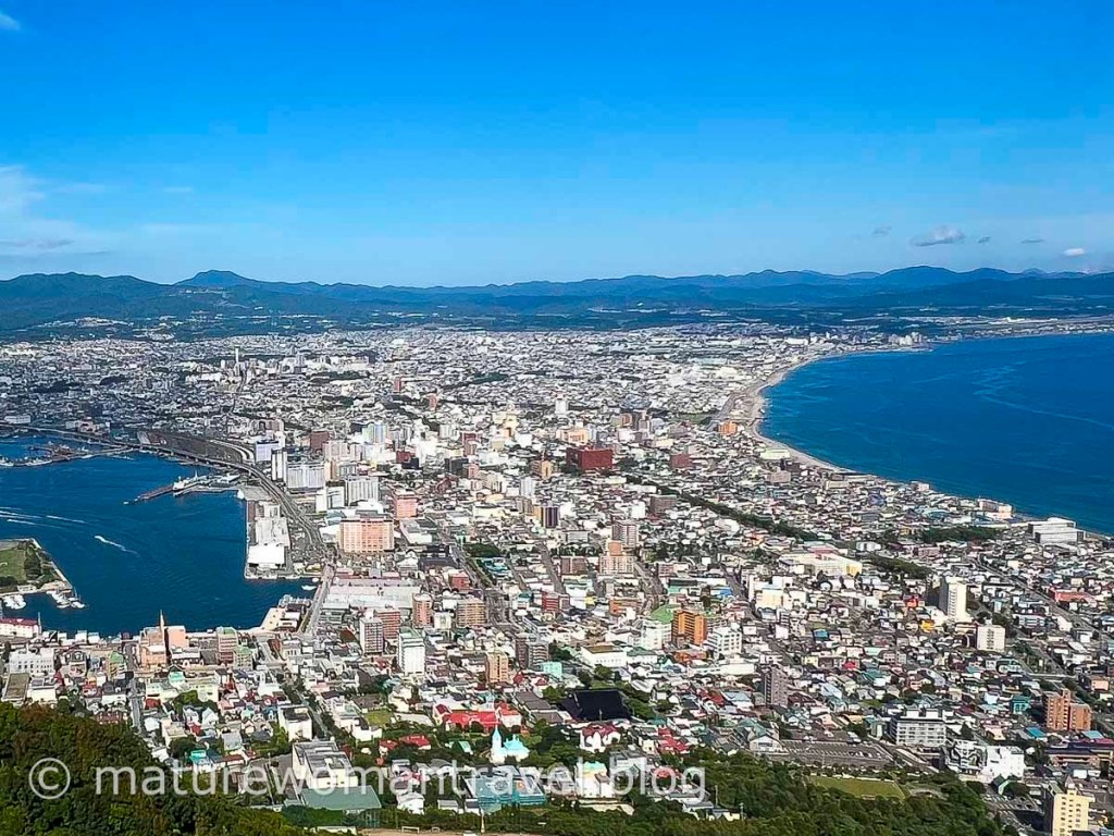 從舊茶屋亭往上坡爬一段路,函館山䌫車山麓站在左手邊,順利搭上䌫車,隨著䌫車迅速上升,函館市景及海灣景色令人讚嘆。展望台可俯瞰函館市區及周邊的山海美景。函館山夜景獲「米其林綠色指南・日本」以最高評價三顆星推薦。可惜得搭火車回大沼公園站,無法久留,也許下回有機會到訪函館再安排一天住市區 ,好好欣賞函舘山的夜景。