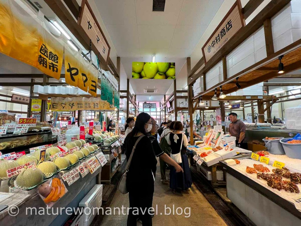 抵達函館車站旁的朝市已近中午,人潮仍洶湧,販賣生鮮蔬果、海鮮、乾貨攤位櫛比鱗次,市場內、外叫賣聲此起彼落,生魚片看起來新鮮可口,各式海產非常誘人,可惜早餐在飯店吃很飽,只好放棄現場品嘗,看到曬乾干貝一大包日幣1萬元,忍不住買回台灣慢慢享用。