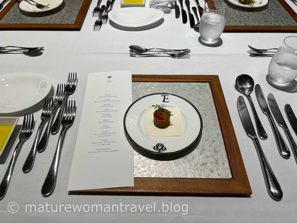 服務人員帶領我們就坐,白色桌布上放置刀叉等餐具令人嘆為觀止,非常正式的法國餐共11道菜,採用北海道新鮮高級食材精心烹調而成。