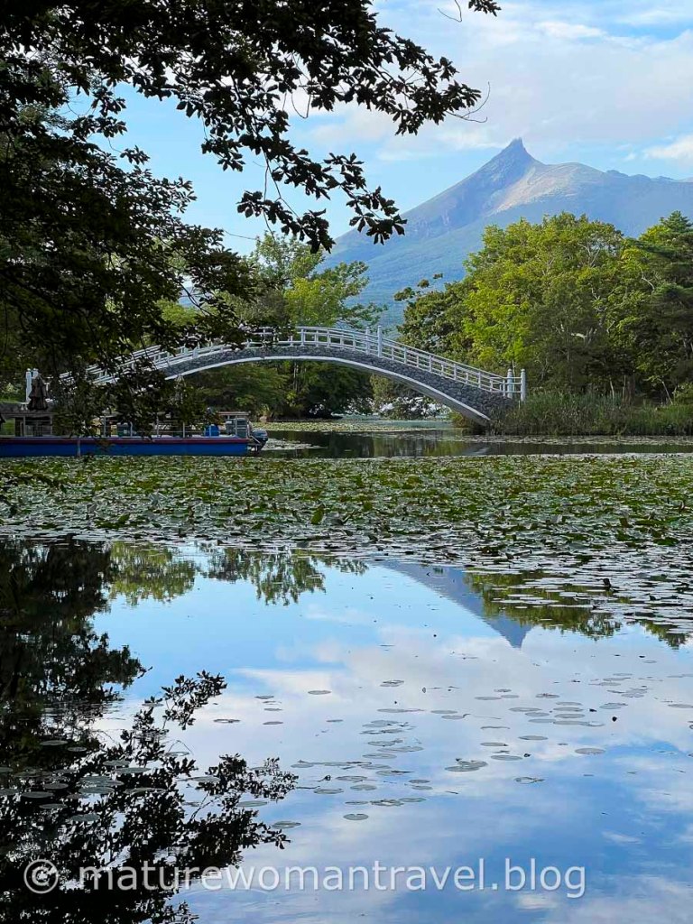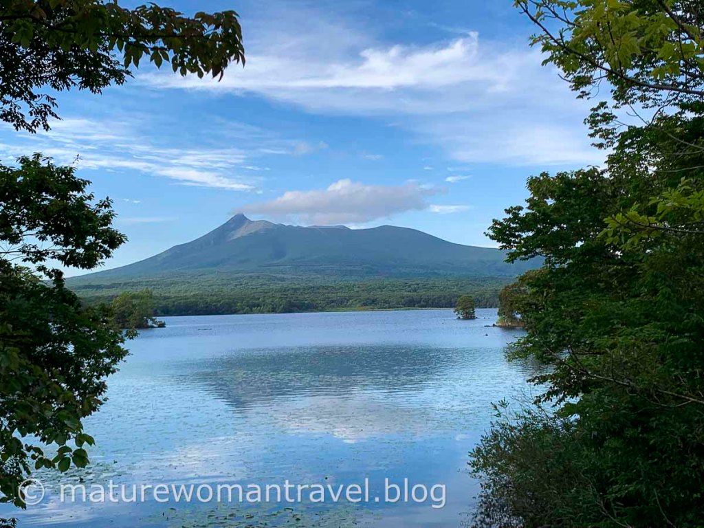 遠處的駒岳倒映在湖中美極了,大約健行一個小時回到出口,遊客已離開,商店也即將打烊。