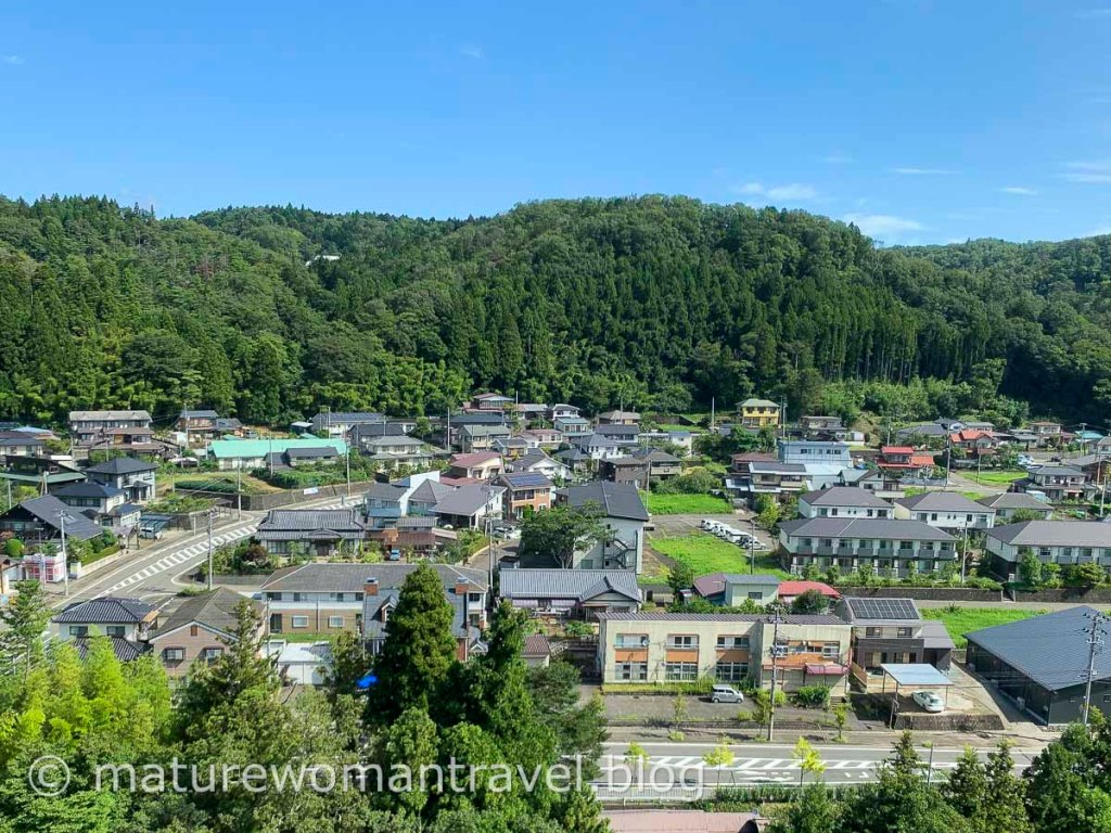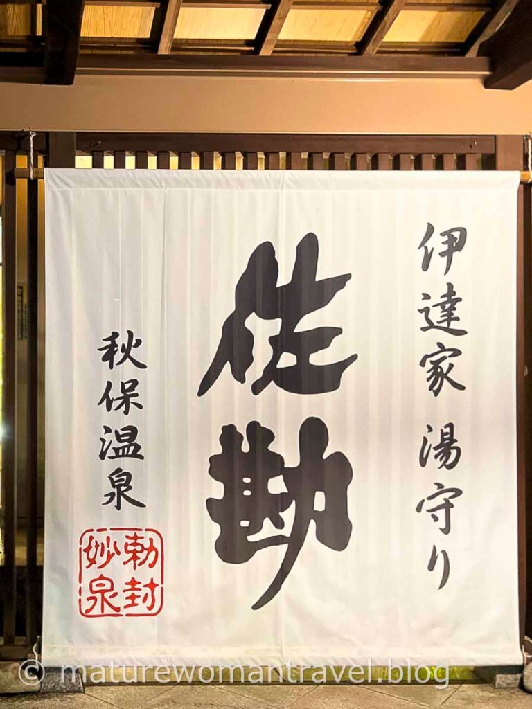 接駁巴士出仙台市區往山形的方向行駛,車多稍有塞車,左轉向南往秋保溫泉沿途綠意盎然,優美的山林景緻,約30分鐘抵達,門前碩大的布幕寫著「伊達家湯守 佐勘」,彰顯千年歷史之宿的氣勢。