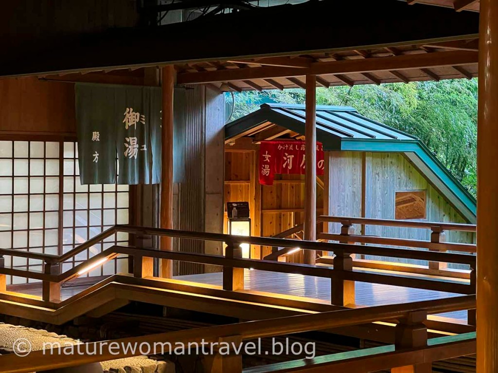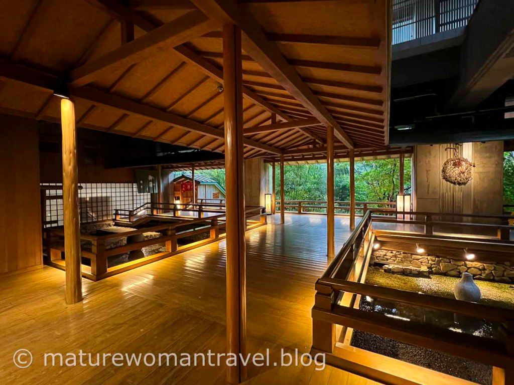 穿上旅館準備的浴衣,通往公共浴池的廊道,傳統日式庭園造景,竹林綠意盎然,沈浸在大自然的溫泉風呂。