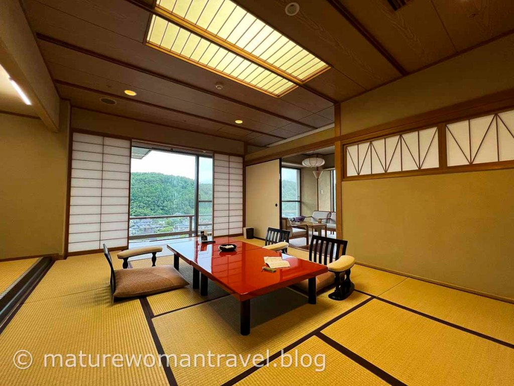 入住飛天館高樓層,房間非常寬敞,和室榻榻米地板,邊間有二面窗景,視野極佳,可俯瞰秋保溫泉山川秀麗景色。