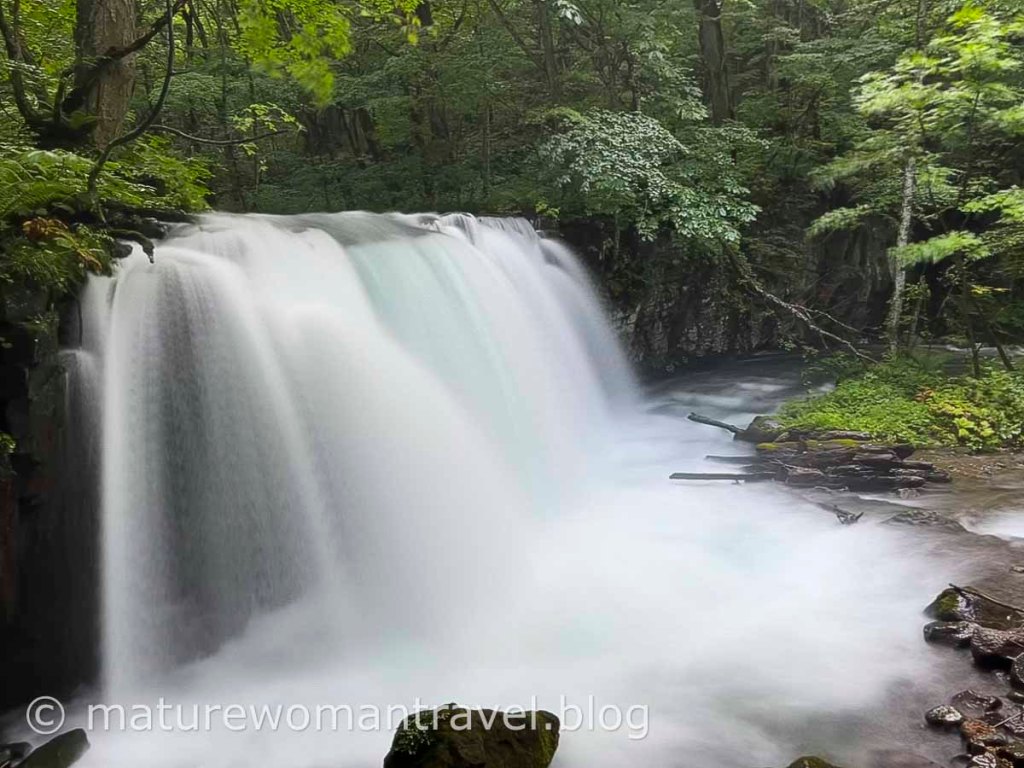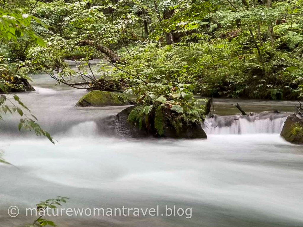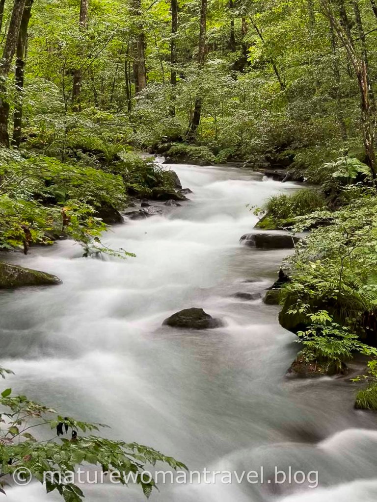 近日雨量豐沛,溪流兩側山壁時不時出現瀑布,有的如絹絲細水長流,有的從崖邊奔流而下,9月初在日本東北地區仍相當炎熱,但走在奧入瀬溪流步道卻涼爽舒適。走一段路後得跨過橋走到對岸,見湍急的河水在石頭間飛奔,滿眼綠林襯托下,像一幅幅流動的風景畫。雖然秋天楓紅時節是首選,但一年四季都各具特色,值得多次造訪體驗不同風情。