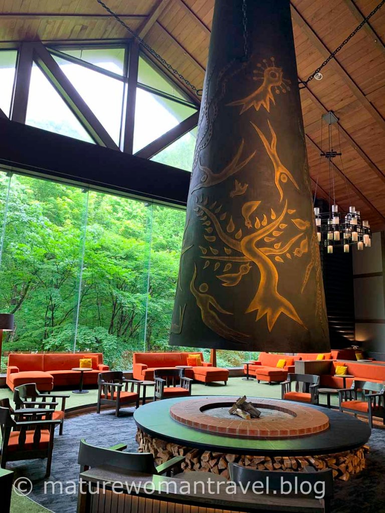 星野奧入瀨溪流渡假飯店位在二條溪流交會處,蓊鬱的山林間,進門大廳挑高落地窗外翠綠景色,映入眼簾的是岡本太郎創作的名為《森林神話》的巨大壁爐。沙發圍繞大暖爐,歡迎旅客歇歇腿,欣賞四季變化的窗景。