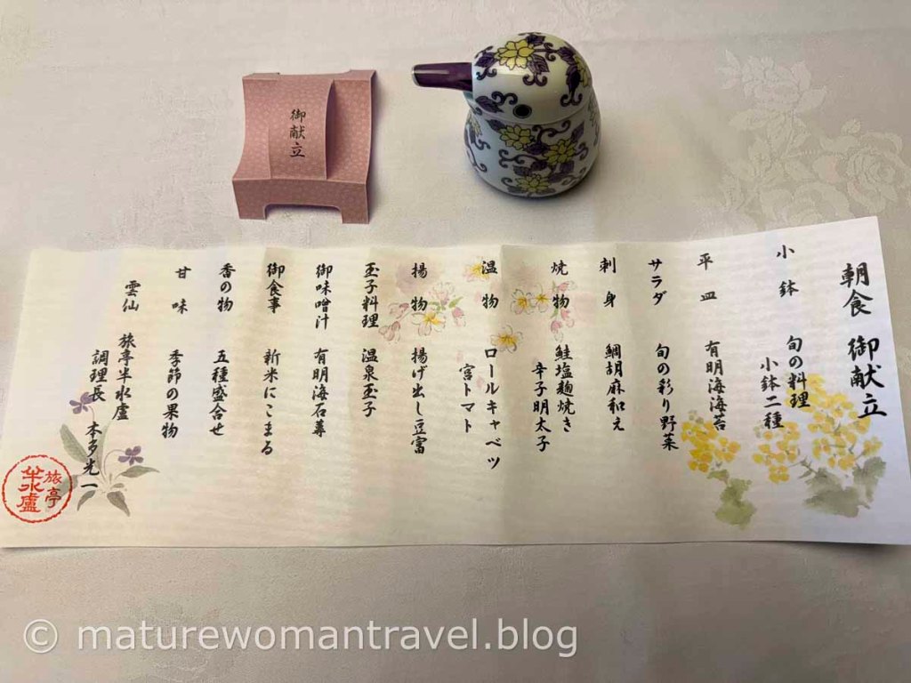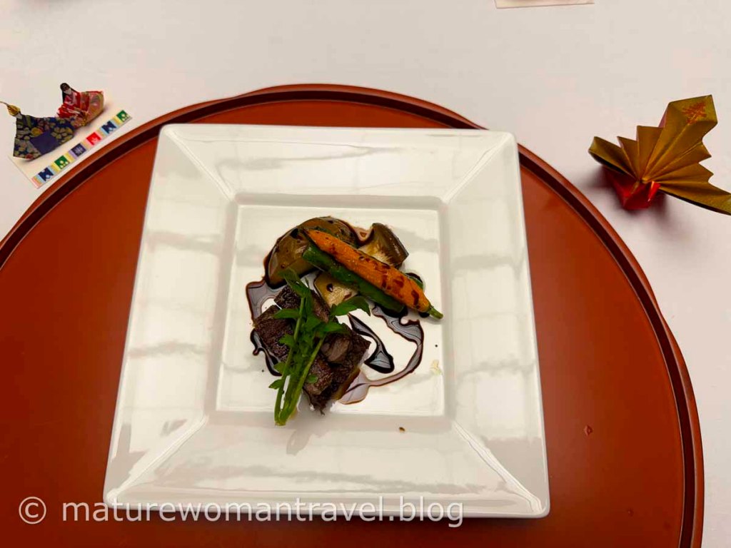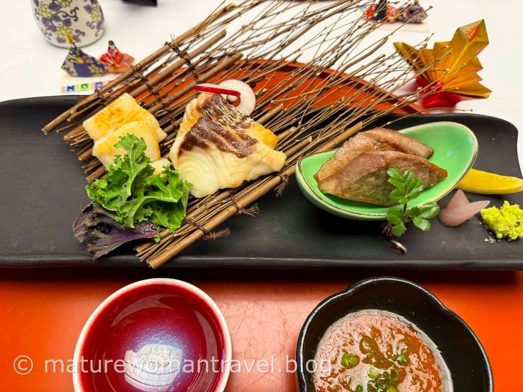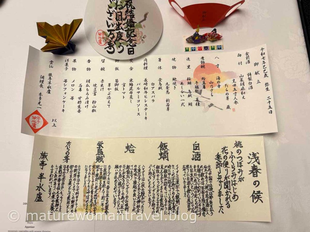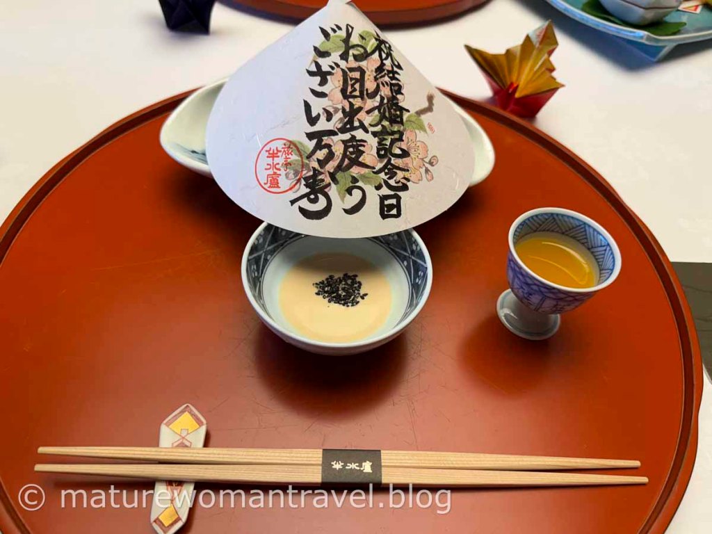 入住前已事先向旅館表示我不吃生肉,旅館同意調整菜色並貼心詢問是否慶祝何種紀念日?才想起很巧當天是結婚紀念日。圓形拖盤上擺放錐狀紙以毛筆寫上祝福的文字,在前菜中藏有一對紙折的精巧人偶,穿著華麗的和服,令人讃嘆。還沒開始品嚐料理已被深深感動。