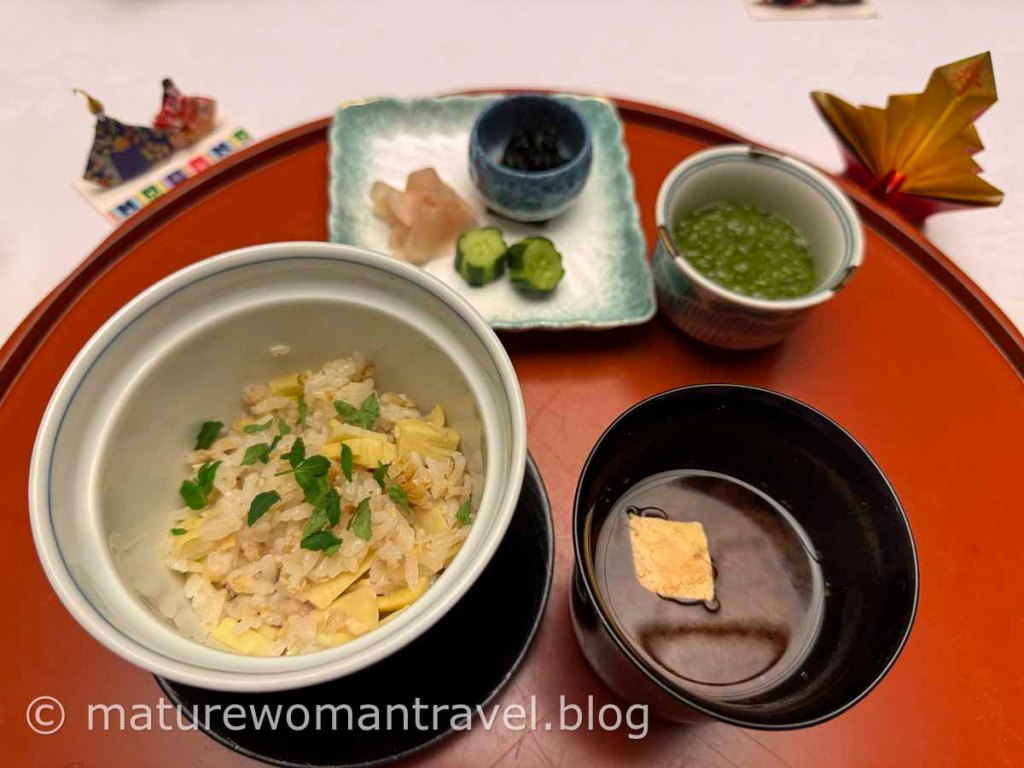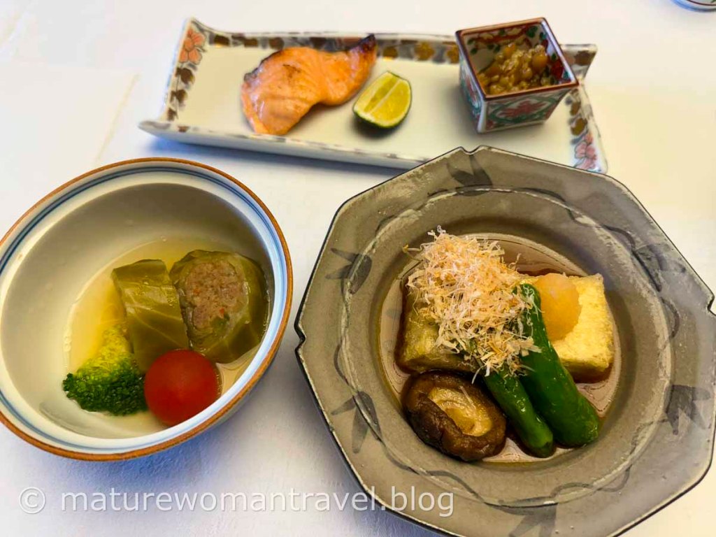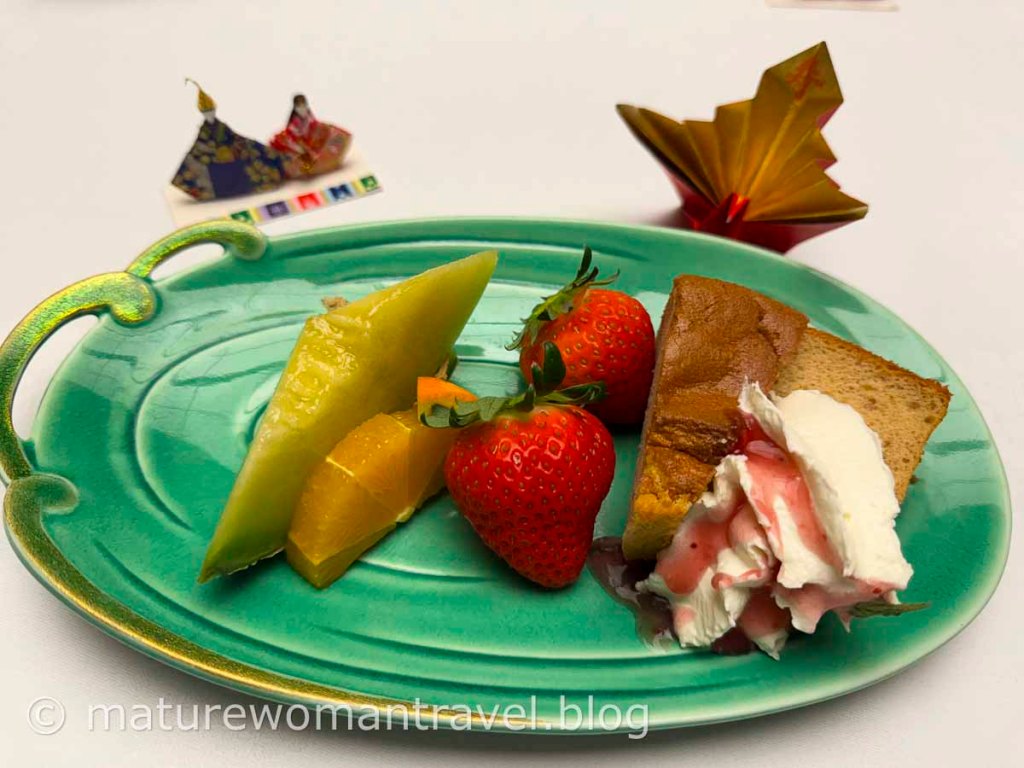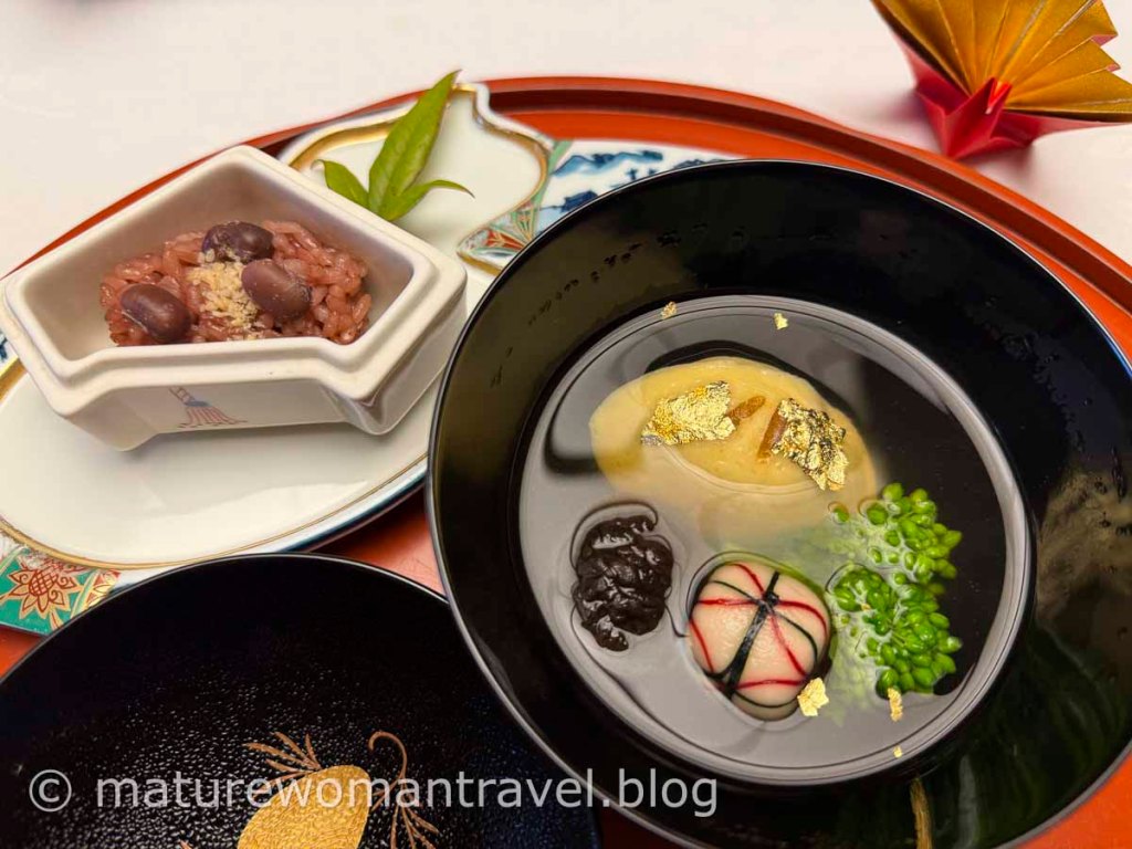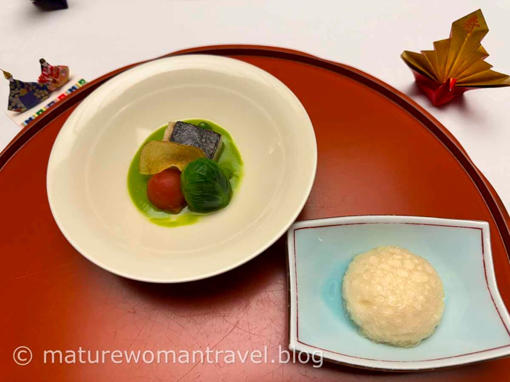 入住前已事先向旅館表示我不吃生肉,旅館同意調整菜色並貼心詢問是否慶祝何種紀念日?才想起很巧當天是結婚紀念日。圓形拖盤上擺放錐狀紙以毛筆寫上祝福的文字,在前菜中藏有一對紙折的精巧人偶,穿著華麗的和服,令人讃嘆。還沒開始品嚐料理已被深深感動。