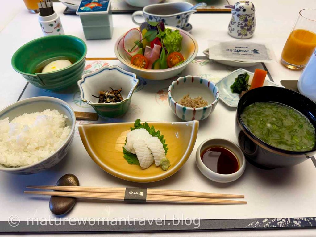翌日早晨依約定用餐時間下樓,餐桌已擺放精緻早餐,但在樓上房間完全聽不到服務人員佈置餐點的聲響,適時的出現為我們送熱食及倒茶水。用餐完提醒稍晚退房會派人到房間收行李,並專車送我們到雲仙溫泉巴士站。