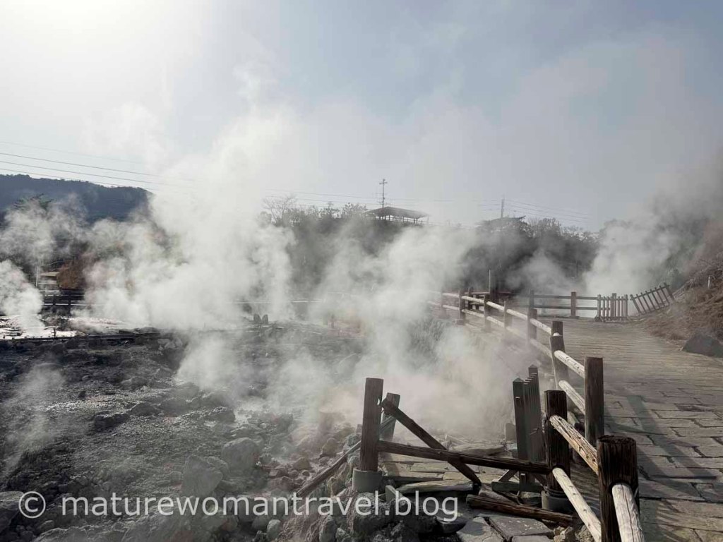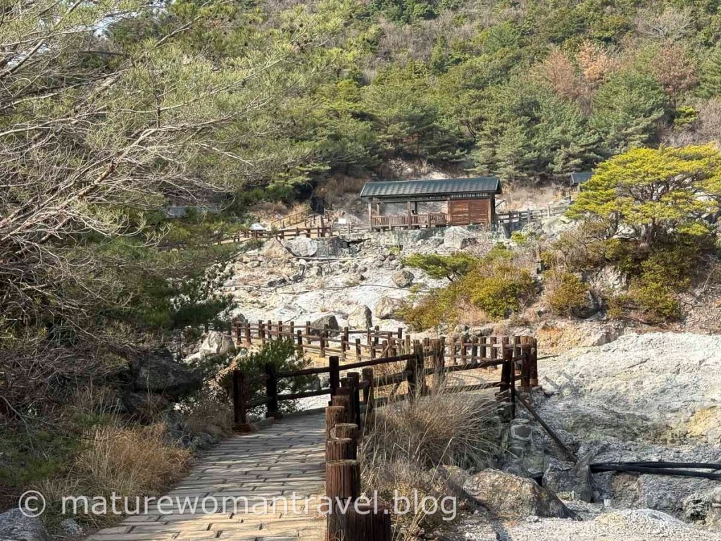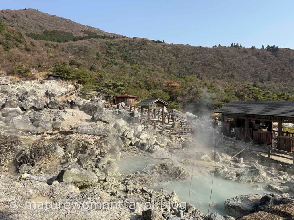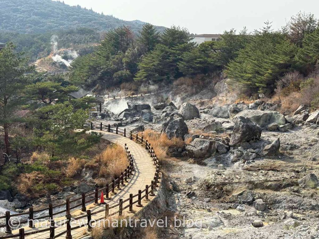 循著步道觀賞各個地獄的地熱地形,有滾燙泥地冒著泡泡;有水蒸氣從岩縫中不斷冒出,空氣中瀰漫硫磺的氣味。走累了可坐在お糸地獄旁的茶屋吃溫泉蛋。