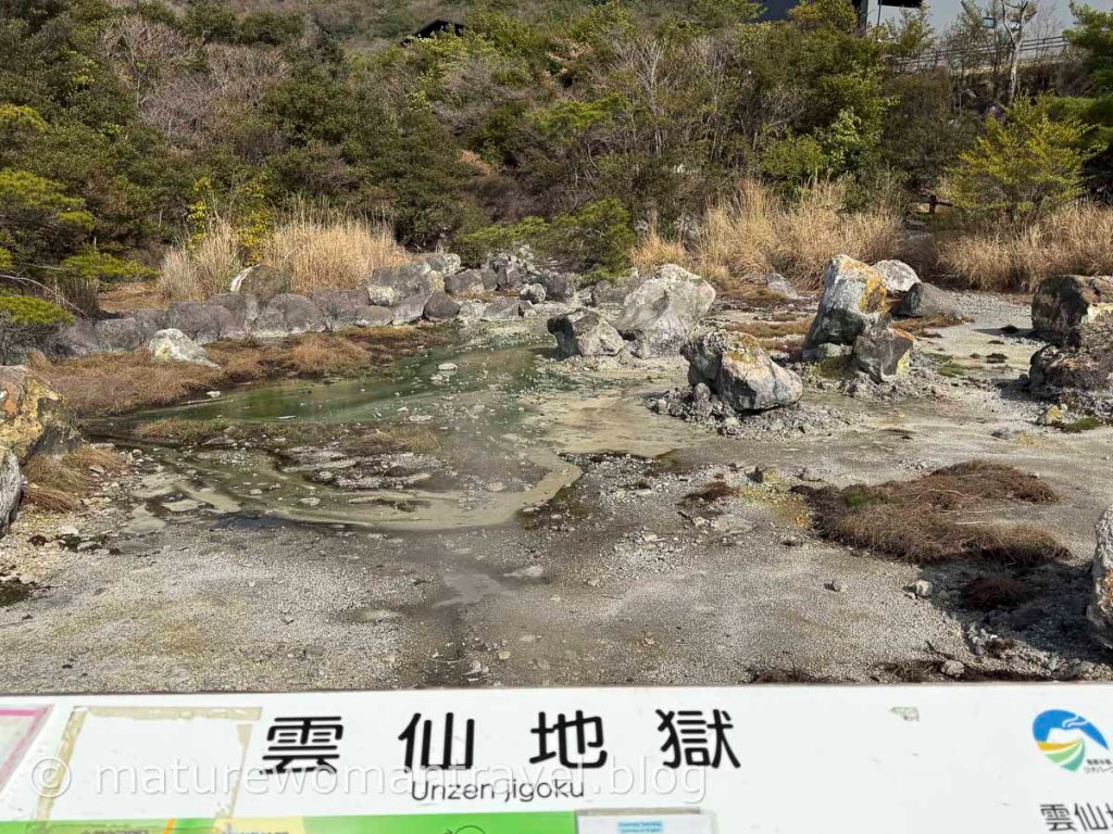 沿途經過許多純樸的海邊小鎮,悠閒的欣賞美麗海景,經過小浜溫泉後巴士左轉上坡往雲仙行駛。隨著連續彎道上升,海景漸漸遠離。半山腰仍有不少住家,時不時有人上下車,走走停停比預定1個半小時稍延後抵達雲仙,在白雲池入口站下車,入住的半水廬旅館在車道對面。