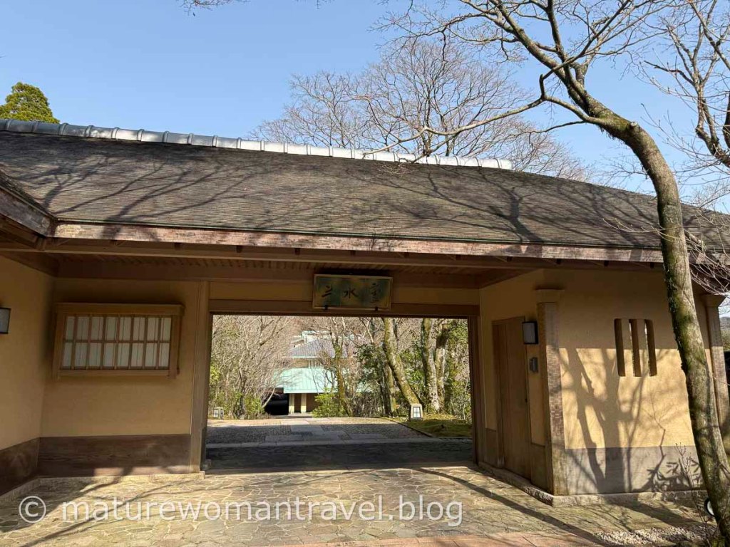 帶著雀躍的心情抵達旅館,從低調的半水廬木質招牌到入口有一小段路,兩旁樹蔭庭院深深,木格柵門緊閉,按門鈴報上姓名,門緩緩開啟,向院子走幾步就看到穿著和服的服務人員快步前來迎賓。