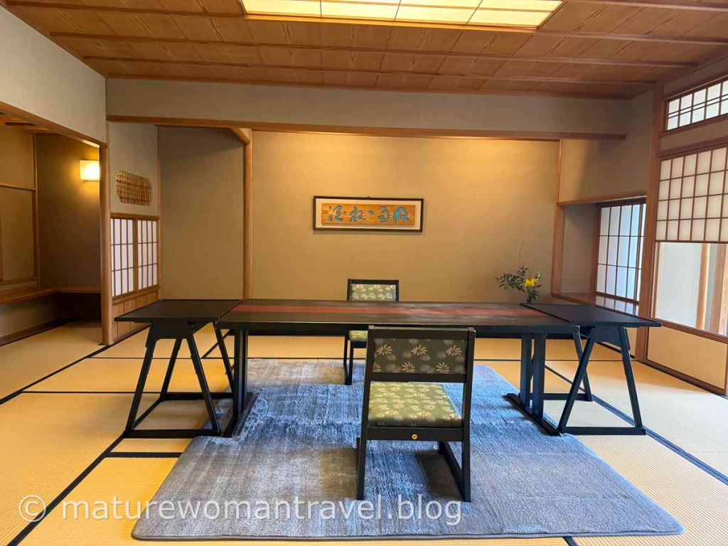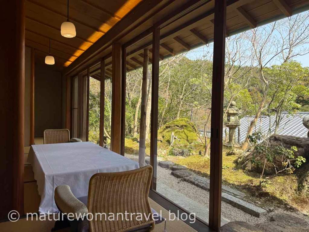 樓下主要是用餐空間,氣派的餐桌,精緻雕刻的屏風,窗外的日式庭園,絕佳的舒適住宿環境。