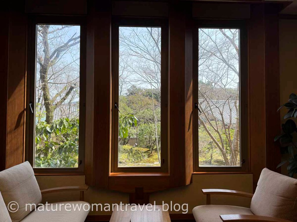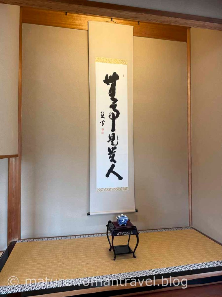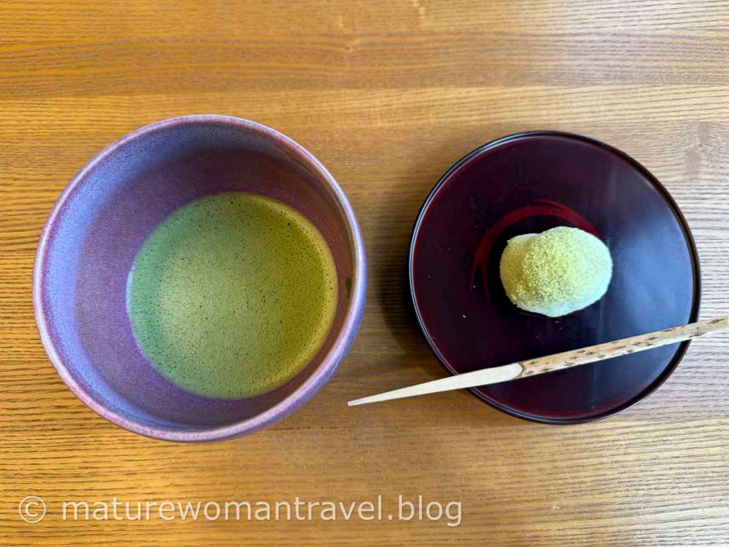 下午兩點來得太早,引導我們稍坐休息,奉上抹茶及和菓子,欣賞𥦬外庭院景緻。