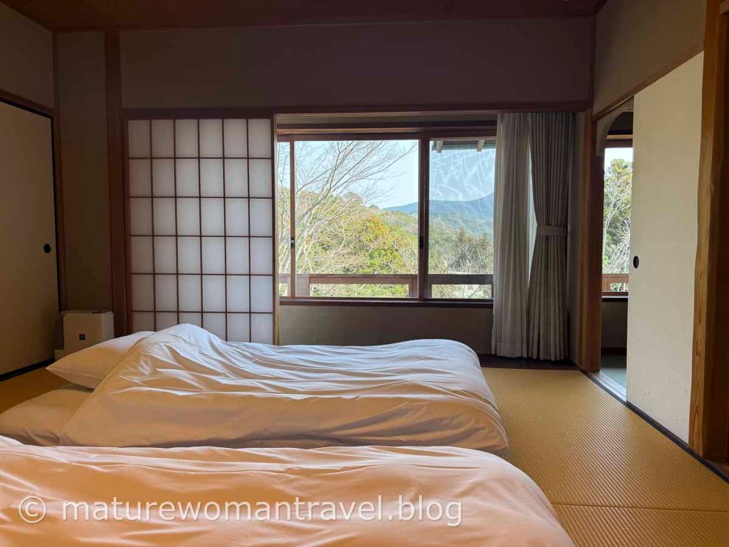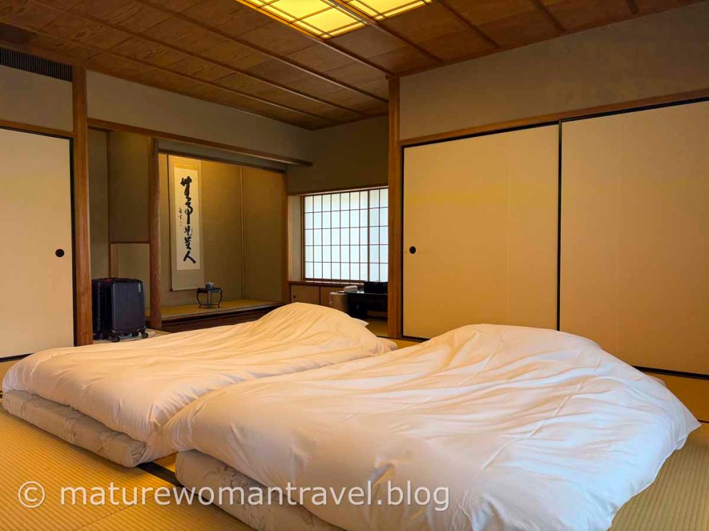 服務人員親切接待並一一解說,入住房間名為水無月,有250平方米。獨棟別墅分上、下兩層樓,因蓋在斜坡上,房間出口在上層。寬敞的玄關,舒適的榻榻米地板,分隔客廳及臥室,衞浴附有私人湯屋。