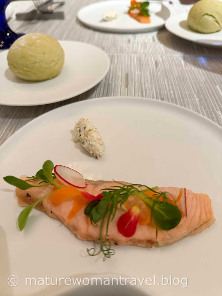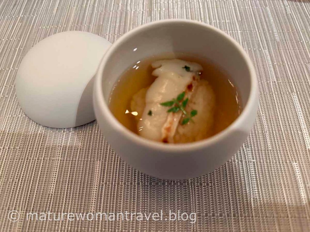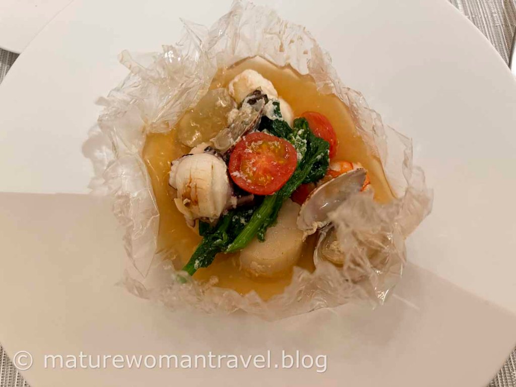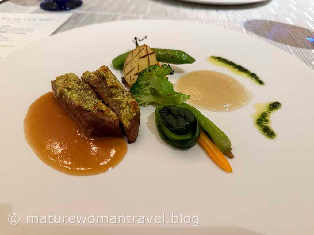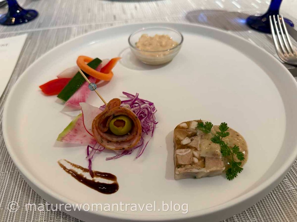 晚餐在教堂中用餐,挑高拱型屋頂,圍繞著彩繪玻璃窗,很特殊的氣氛中享用精緻西式料理。服務人員親切有禮,仔細解說每道菜並頻頻詢問菜色是否合口味?五道菜套餐都可口,但對走了一下午又爬山的我們份量稍嫌不足。還好在文明堂買了蜂蜜蛋糕回房間可以好好品嚐。