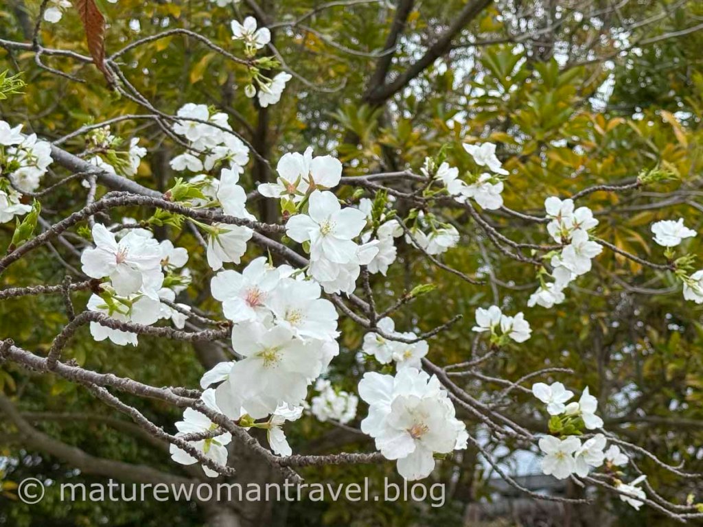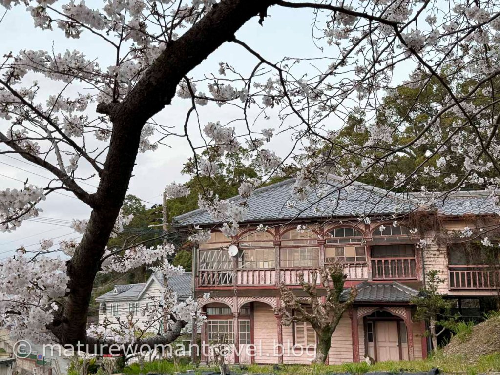 經過山村小巷,房舍階梯式的緊密排列,在櫻花的襯托下景色很美。